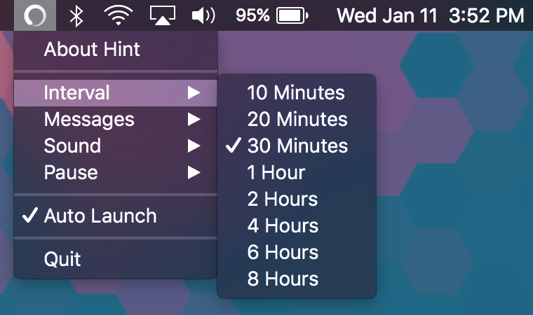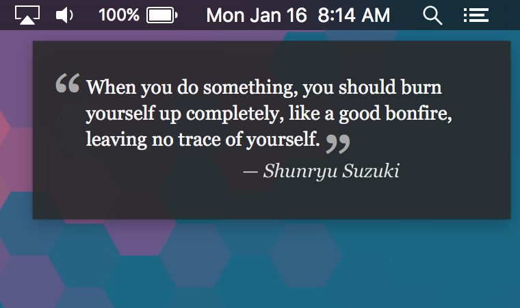 Hint is a simple mindfulness reminder for macOS, built for people who spend a lot of time on their computer. Hint periodically delivers mindfulness-quotes to your desktop, reminding you to re-center yourself in the present moment.