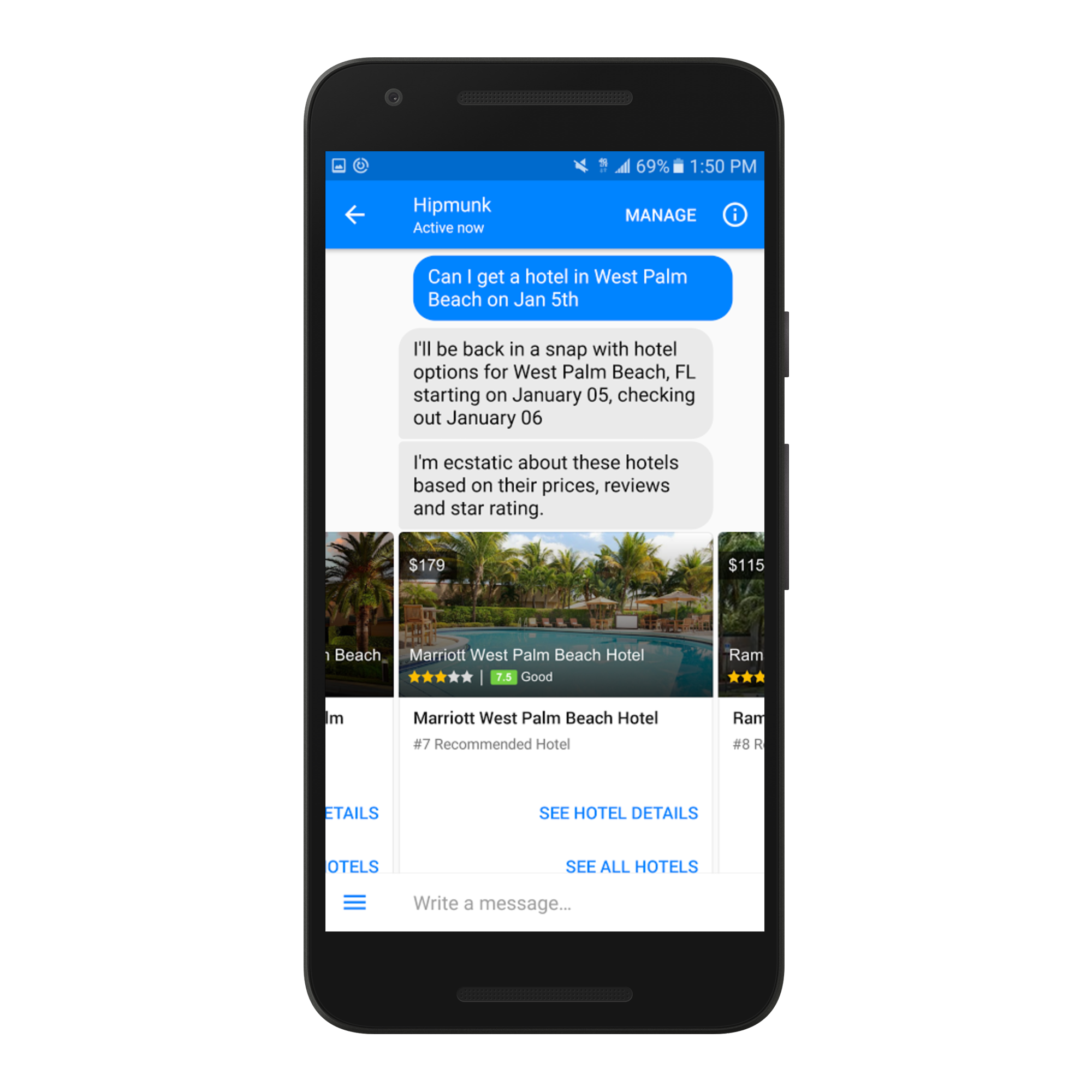I’m a PM at Hipmunk. Excited to share that Hipmunk just integrated Facebook payments into our Messenger bot. Now people can search for hotels, see hotel details in a new webview, and pay for their room without ever leaving Messenger.