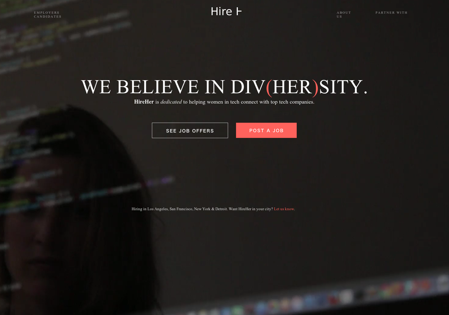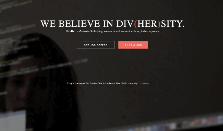 HireHer is on a mission to shrink the diversity gap in tech and help women in tech find jobs they love. It's a simple, elegant way for candidates to discover tech jobs and allows companies to connect with the smartest, most talented female engineers & designers.