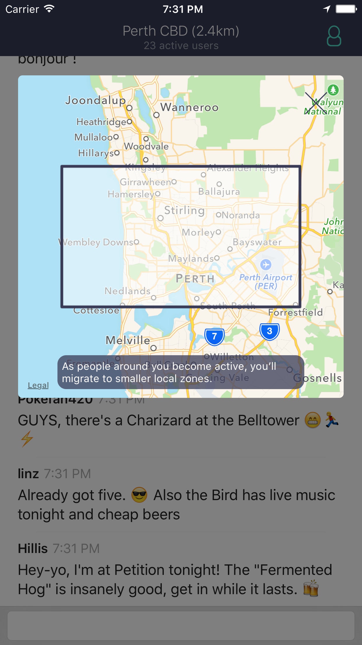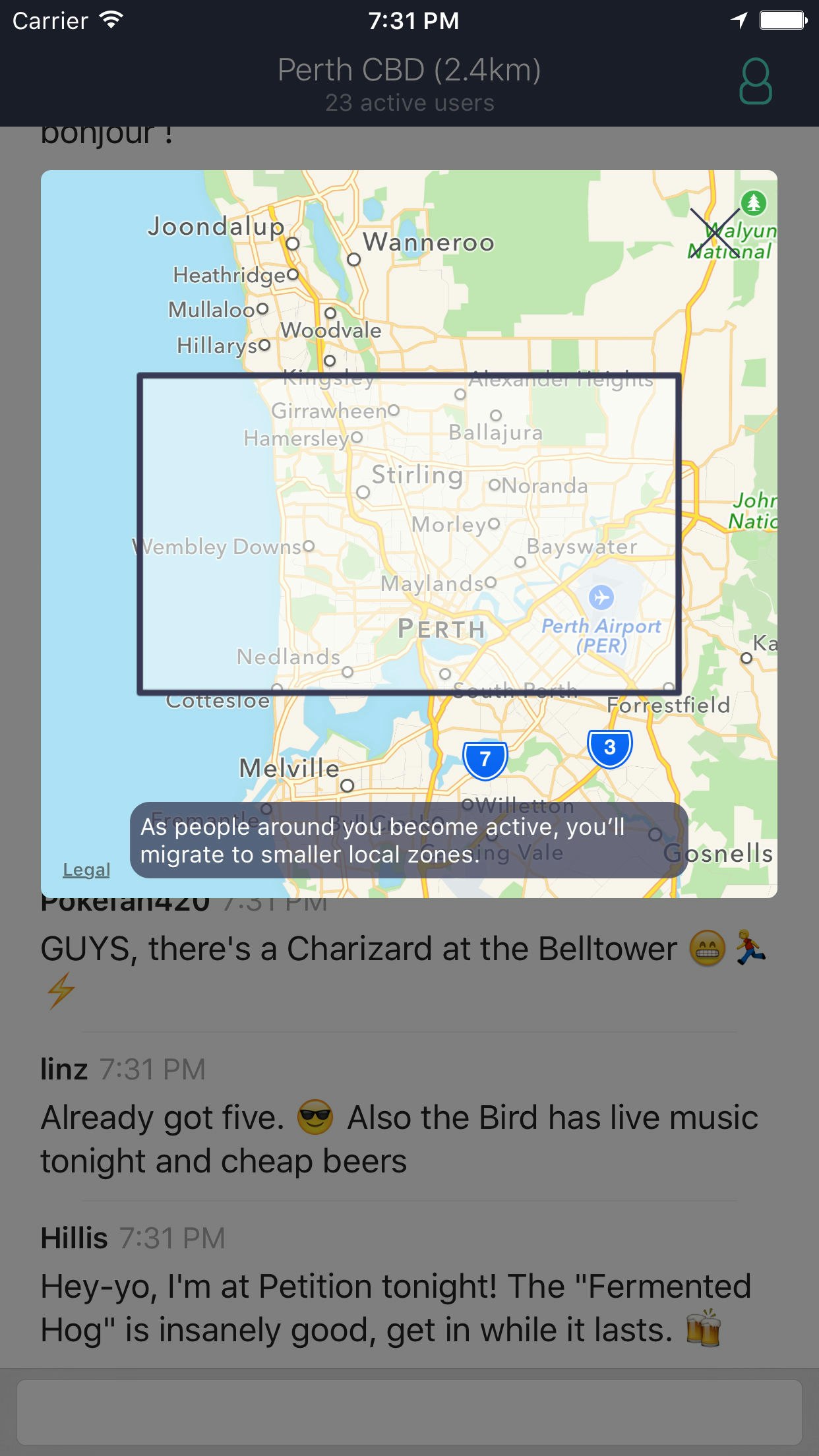 The idea for the app in general came from the fact that I'm working remotely from all over the place, doing the "digital nomad" thing, and thought something like this could be fun. But an app like this needs a critical mass to actually get off the ground and succeed, hence the dynamic growing and shrinking areas based on activity. The idea being it greatly increases the chance when you open up the app, you're there with someone else.