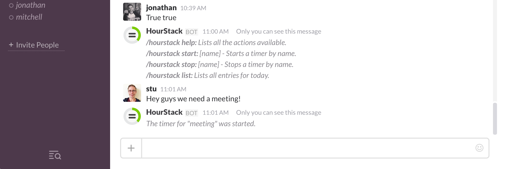 i've been tracking my hours in slack for some freelance work, have been keeping an eye out for something like this! I envisioned it to be a little smarter - i.e. when I send my first message on a given day, a bot would reply asking if I'd like to start a timer.