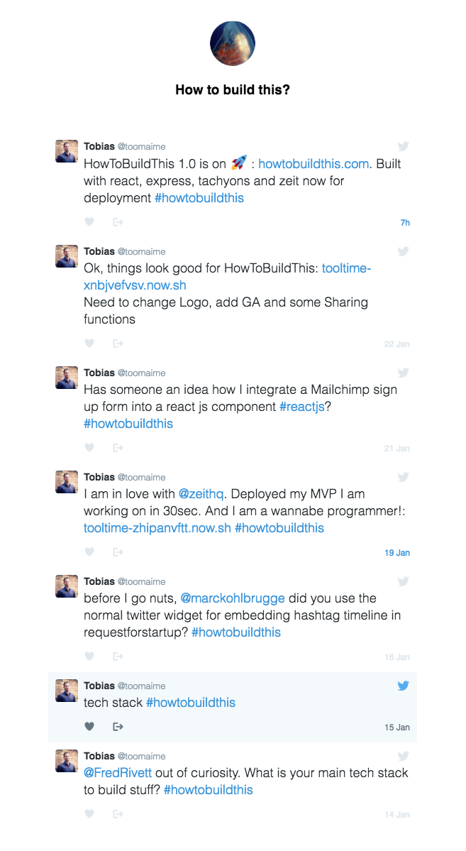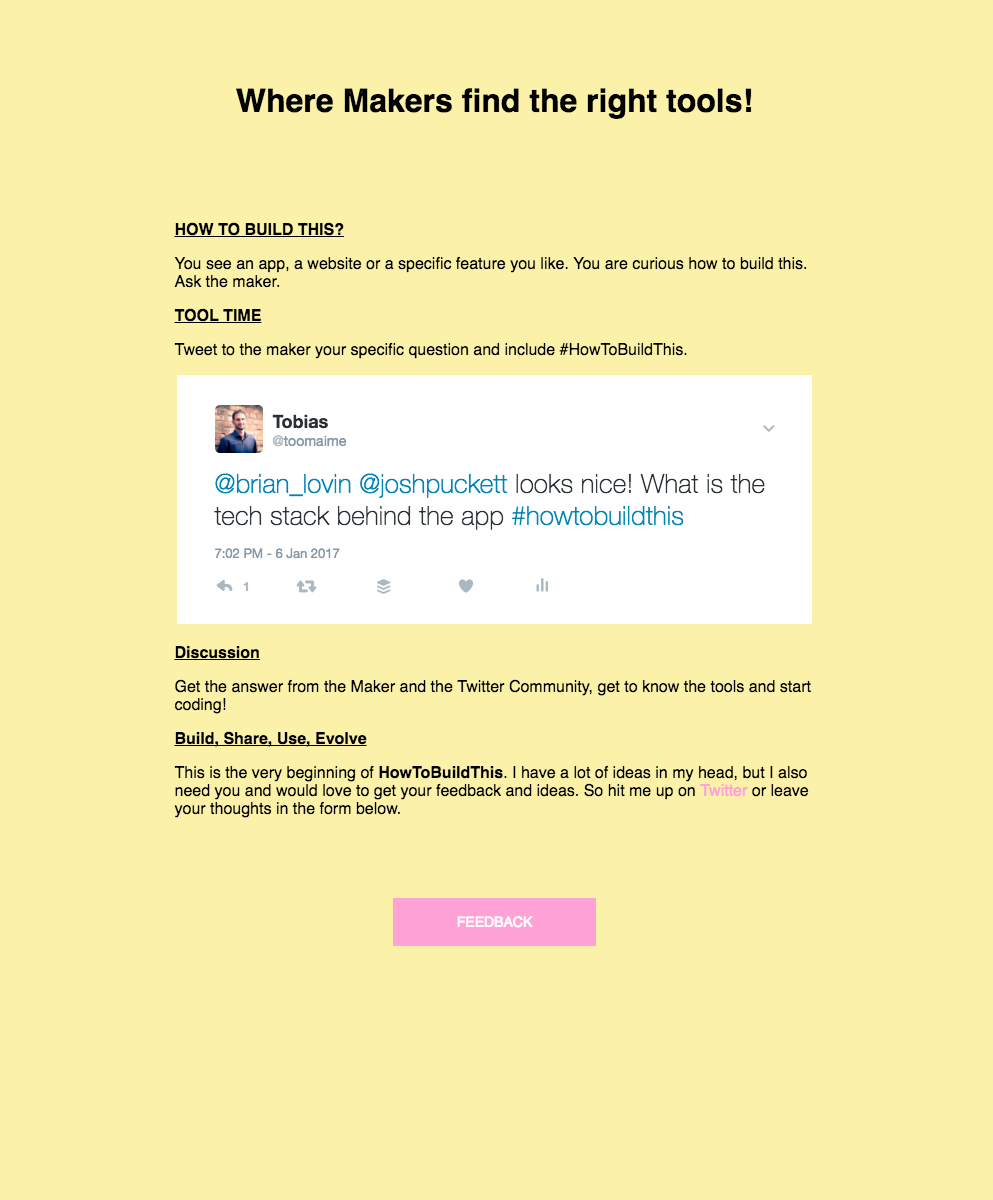 In the last days, I built a simple and lean MVP. You see an app, a website or a specific feature you like. Just ask the maker on Twitter and add the #howtobuildthis. Get the answer from the Maker and the Twitter Community, get to know the tools and start coding!