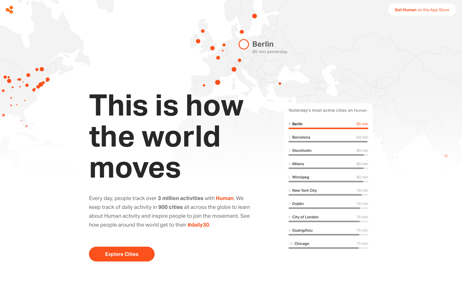 Human motivates people to move 30 minutes or more every day and hosts 20,000 Human Clubs where people share their daily activity and motivate each other to get active. We want to inspire people to get active together.