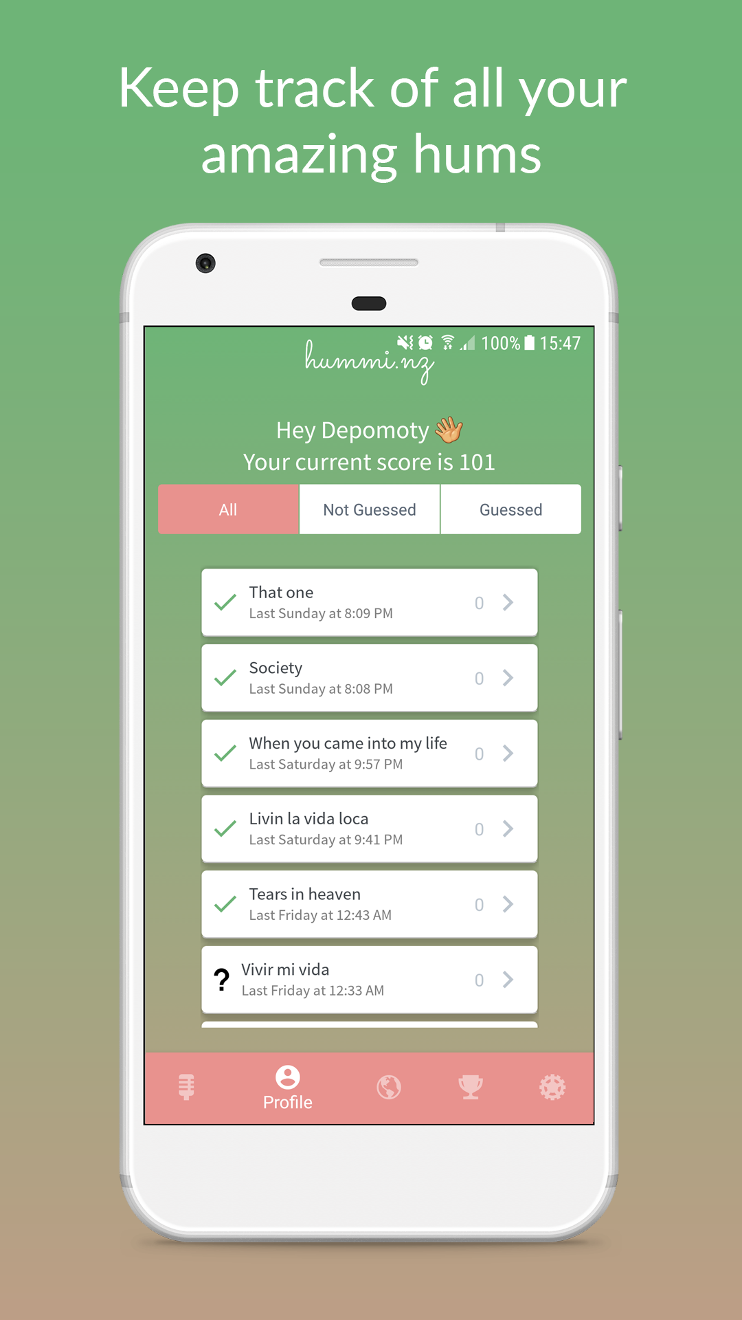 People always hum songs when they are happy πΊ. So why not share this happiness with other people and have more fun in the process? Hum songs and send them to others to guess the song name π. You can also guess what others are humming to earn points and climb the leader-board. Come on board and let's create a community of happy humming people π