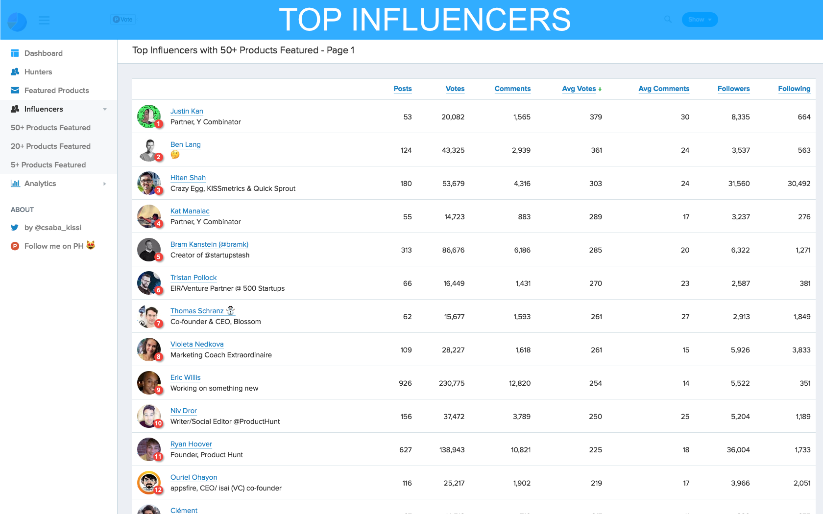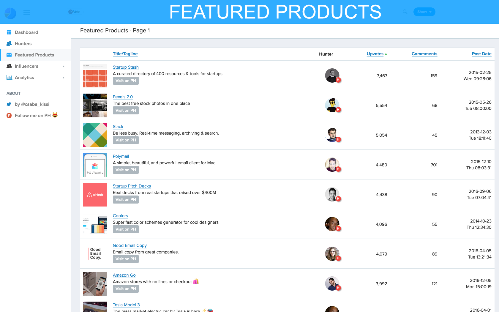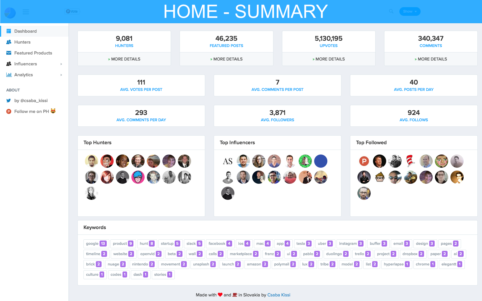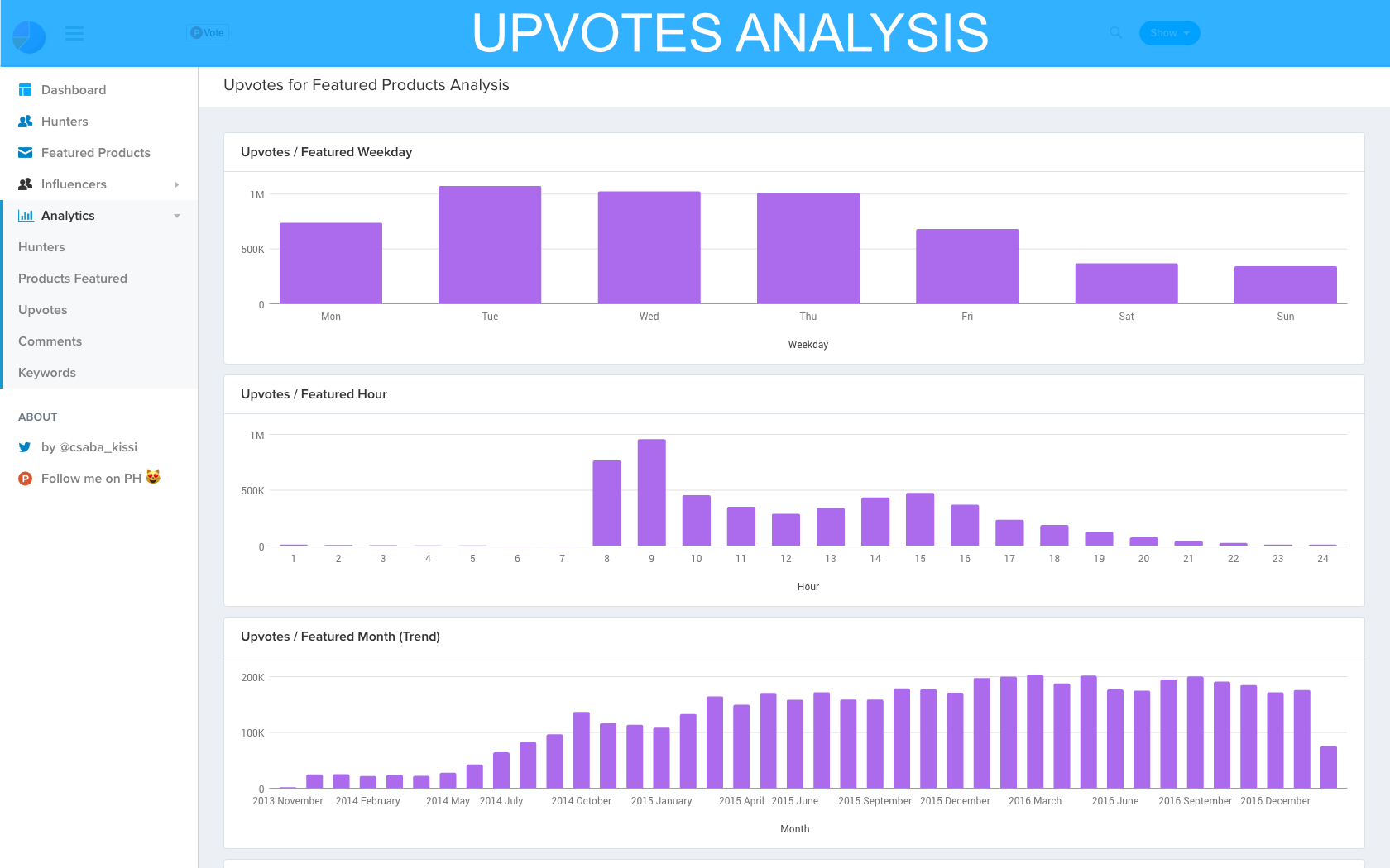 The project was done as an MVP. You can find information about hunters, influencers, featured posts, upvotes, and comments (stats, trends).