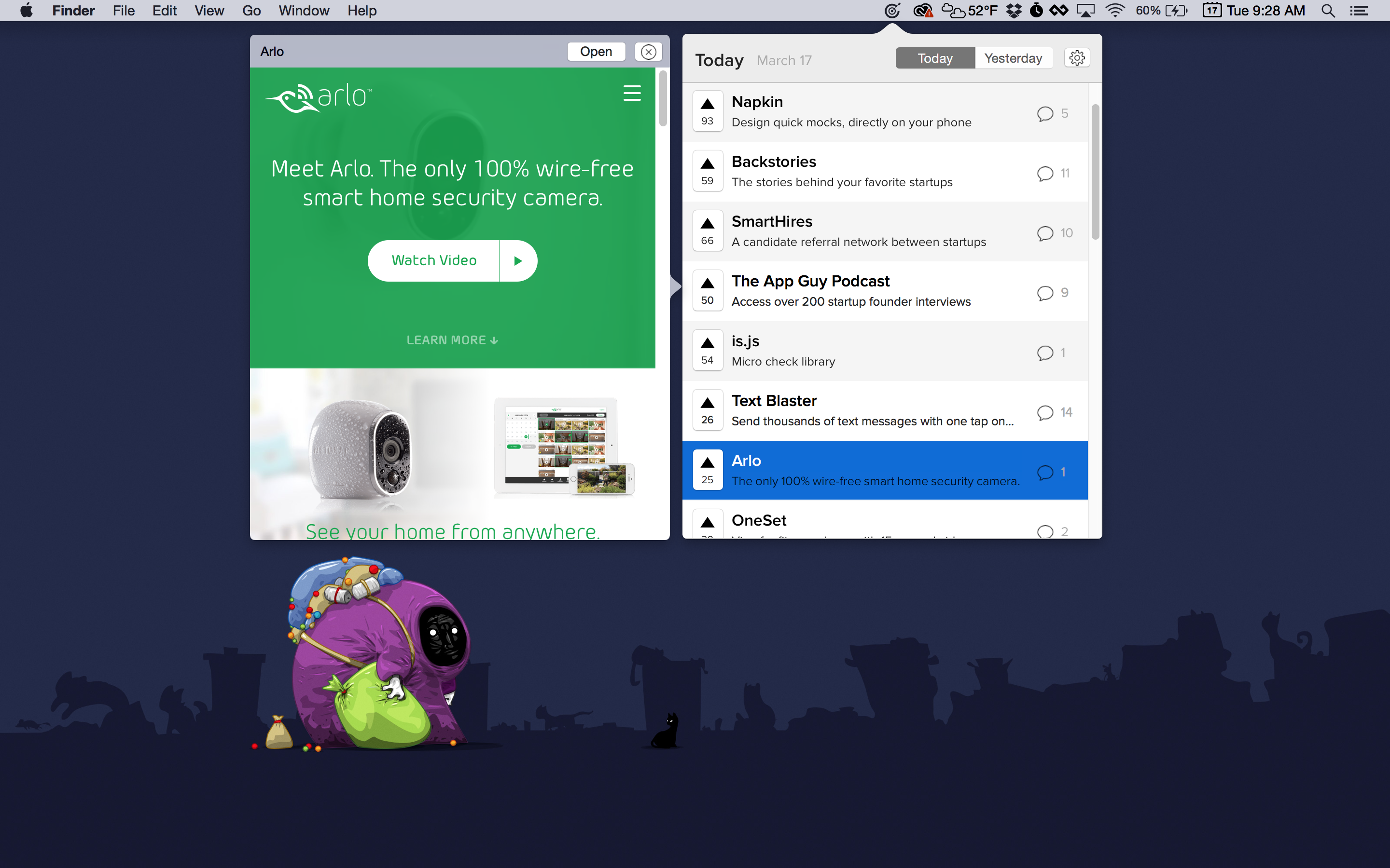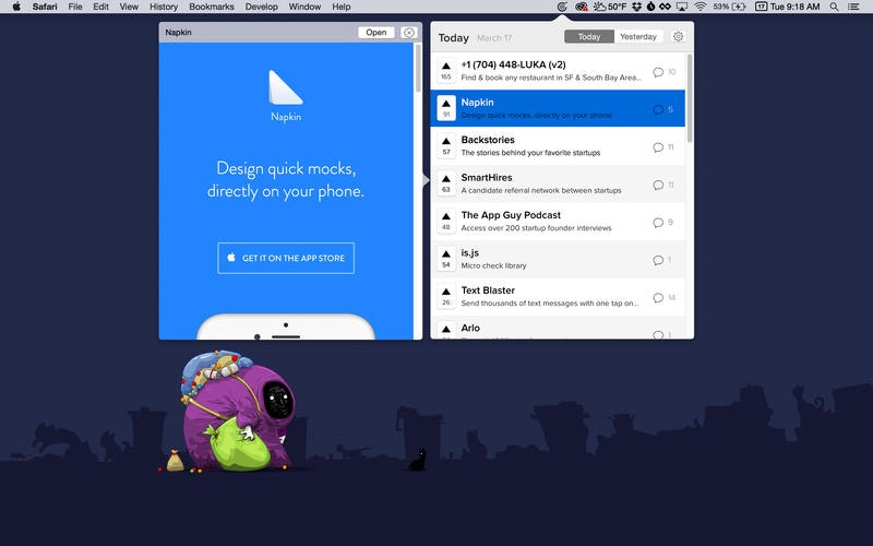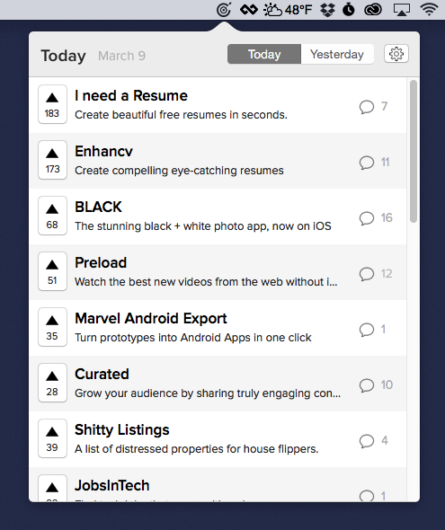 I decided to make Huntr because I am a huge fan of Product Hunt and love checking out the trending items for the day. Having access to PH in my menu bar makes it that much easier to keep up with the days products. I'm an iOS Developer and this was my first Mac app. It was super fun to build and I can't wait to get feedback on it for version 2.0.