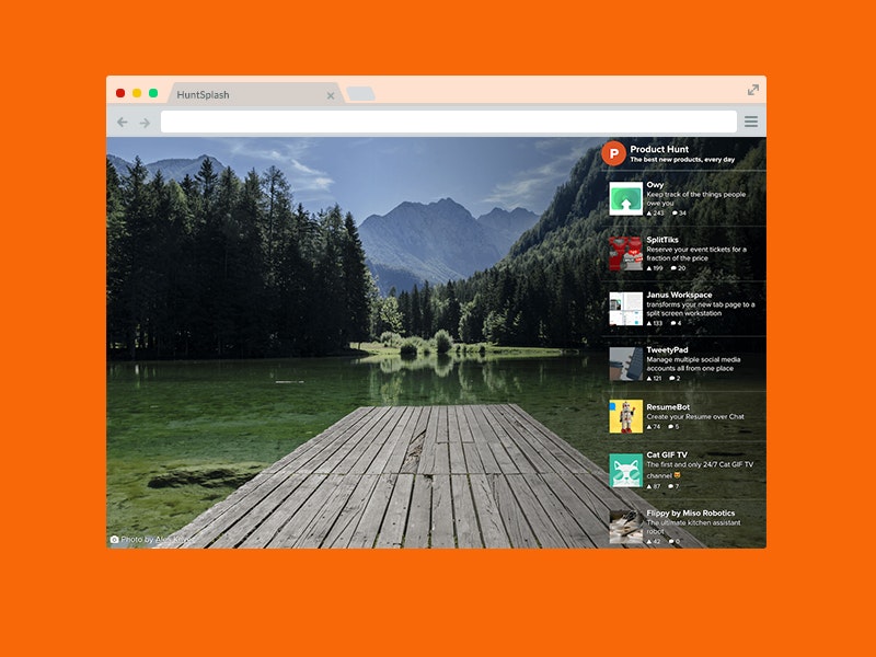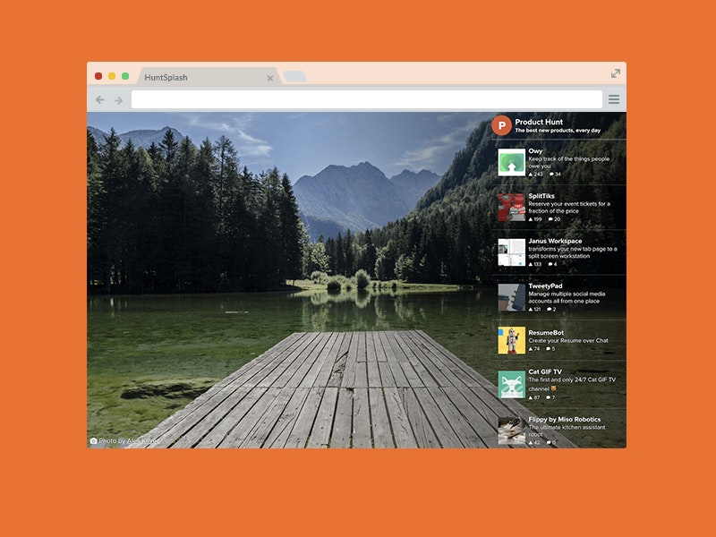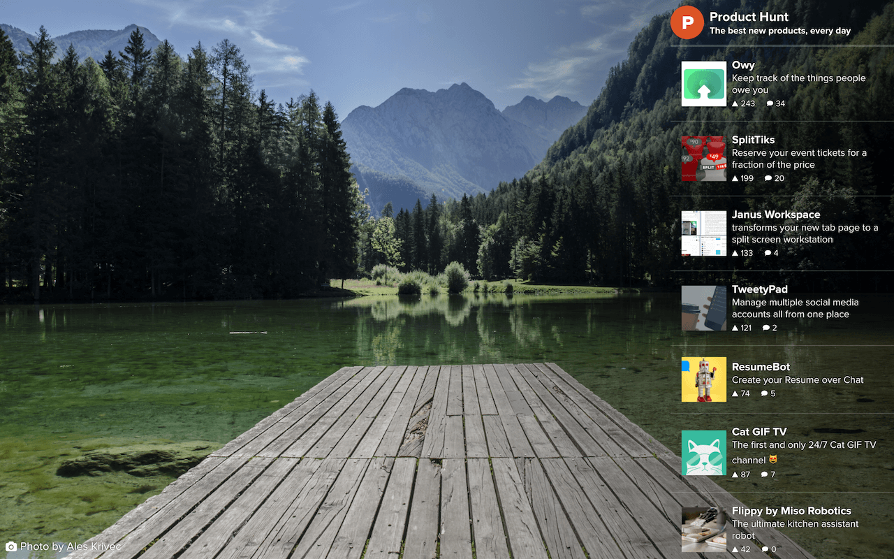 Every time you open a new tab, you get to see a beautiful photo from Unsplash along with top trending products from Product Hunt.