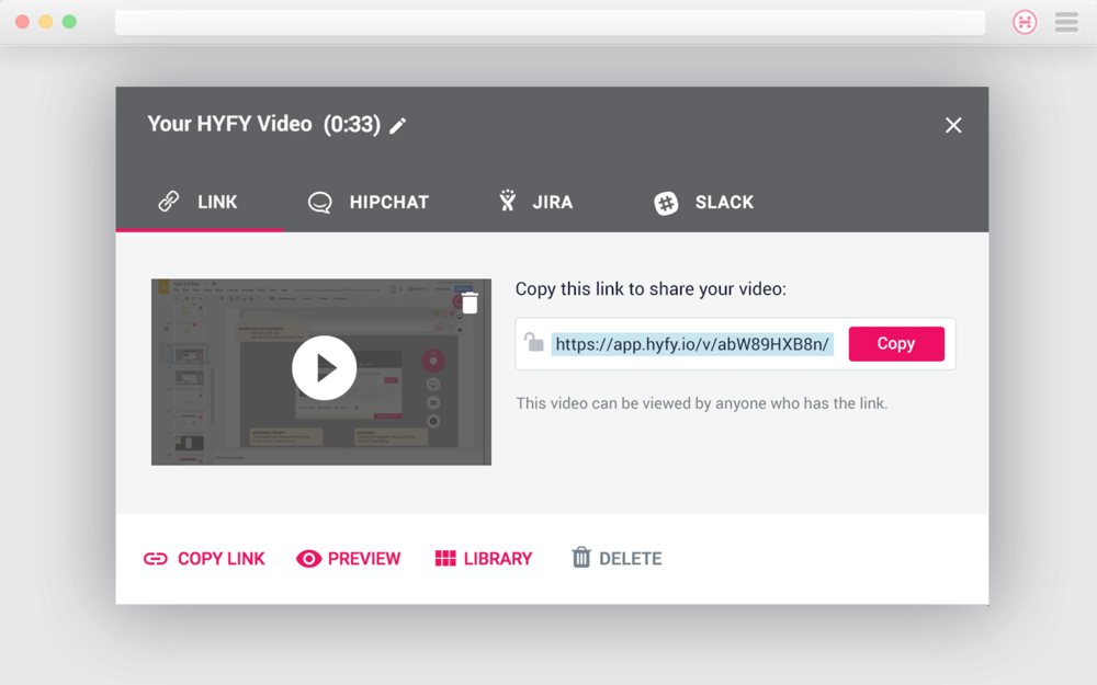 I really like how easy HYFY is to quickly record and share to people on our Slack team, and to clients via email etc. a very simple and fast way to show an issue, error, or demo a feature or how-to. Great product.