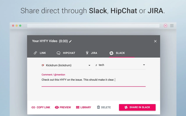 HYFY Screen Recorder is the simplest way to record your screen and voice and share instantly anywhere your team works. Just click record and start talking. When you’re done, share it through Slack, JIRA or HipChat or just paste your video UR… See more
