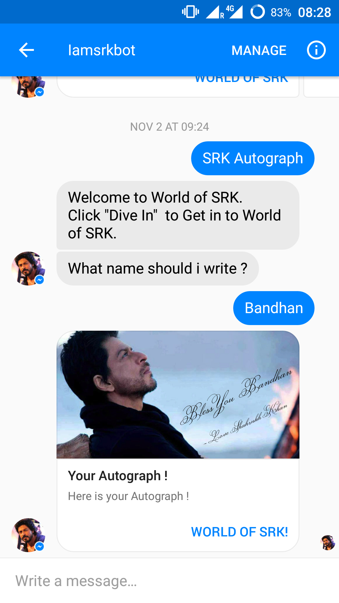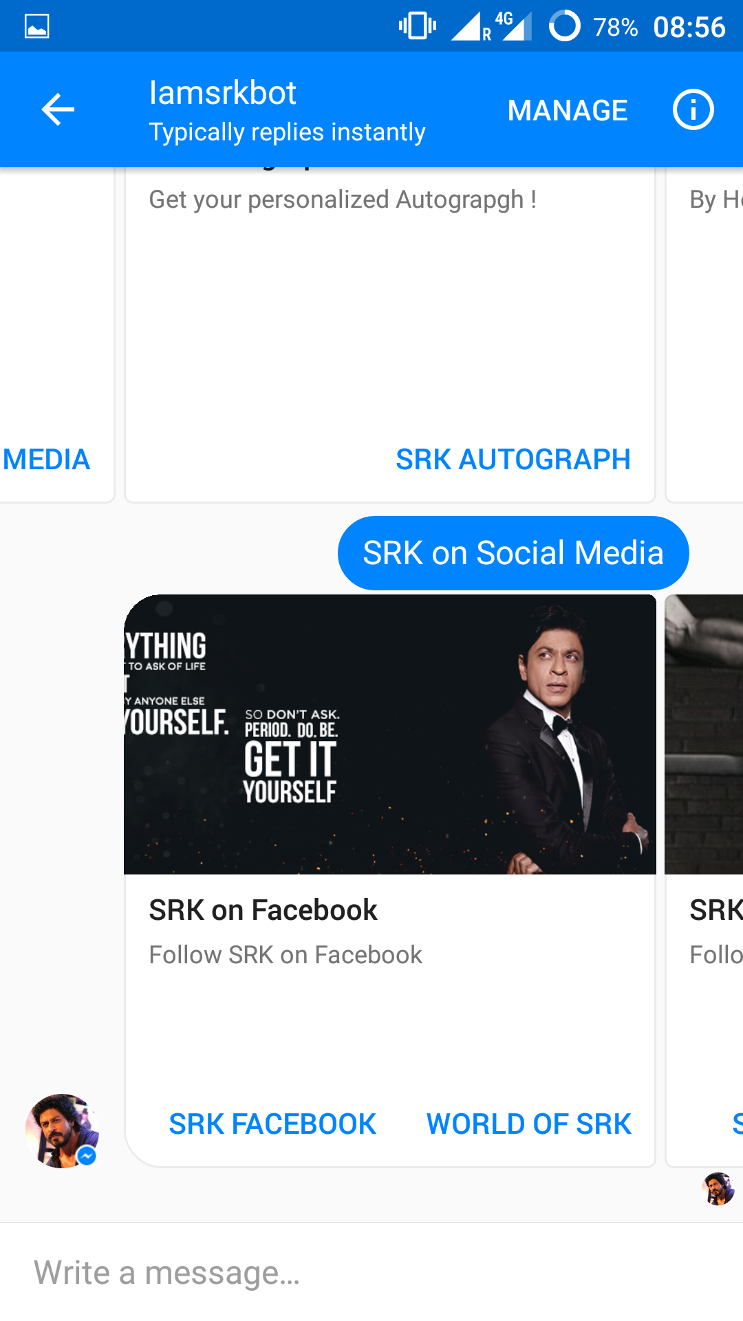 IamSrkBot is a bot of famous actor Shah Rukh Khan of Bollywood, and his fans are trying all the way possible to be updated about him.