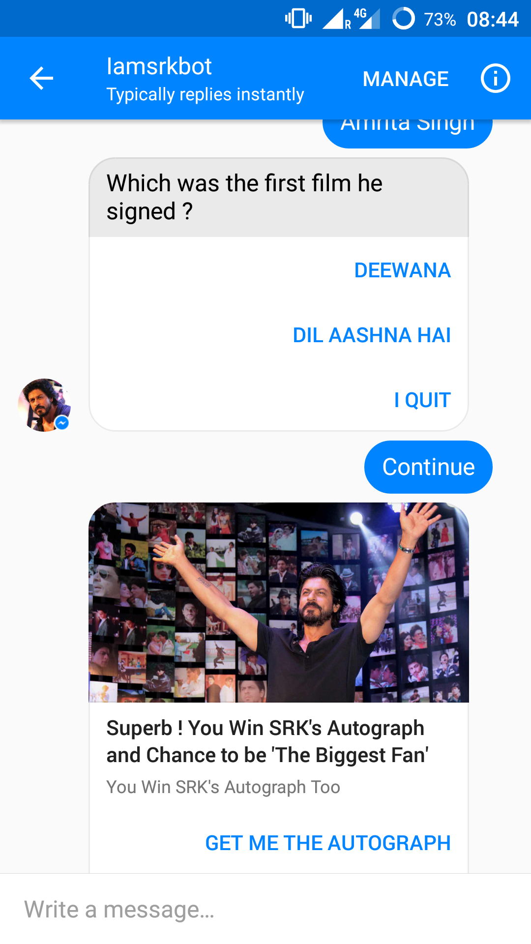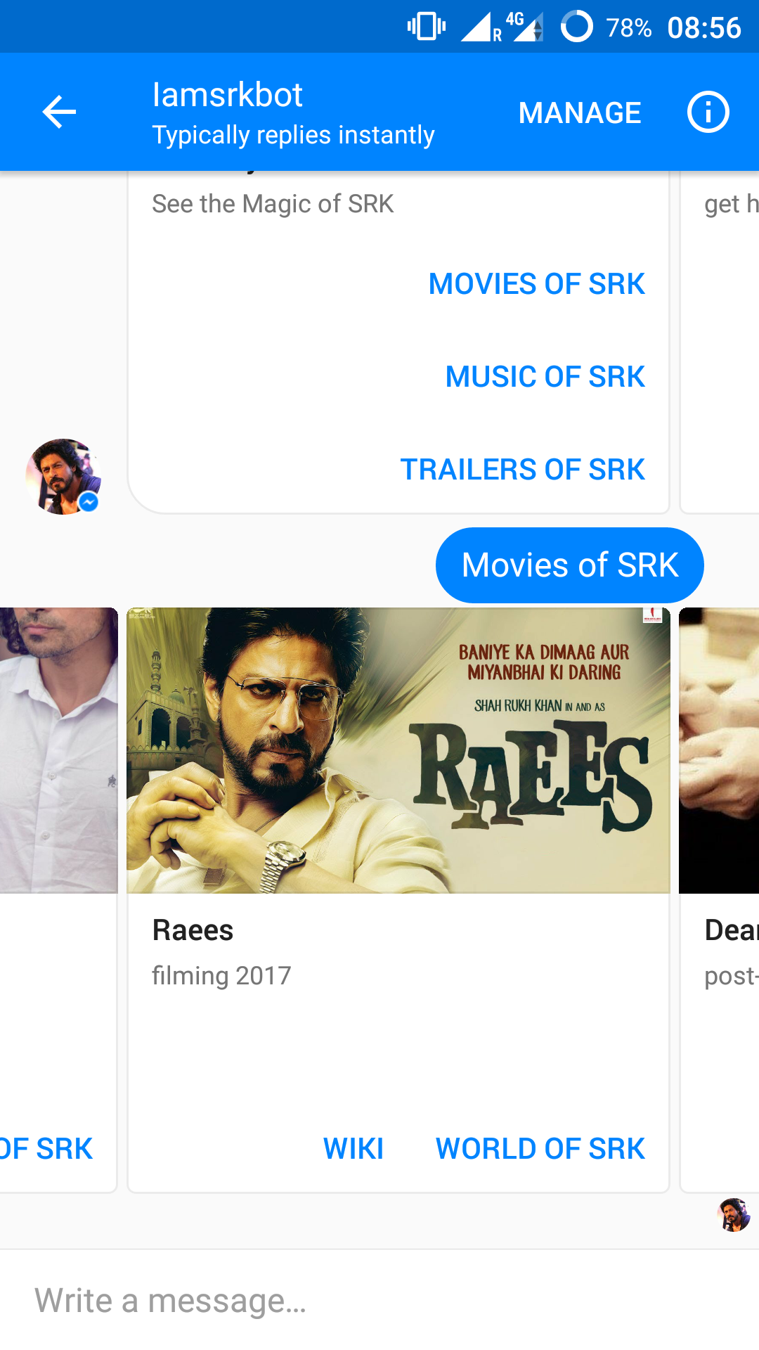 Being a great fan of Shah Rukh Khan, one of the most famous celebrity, i decided to treat the fans with this bot.
