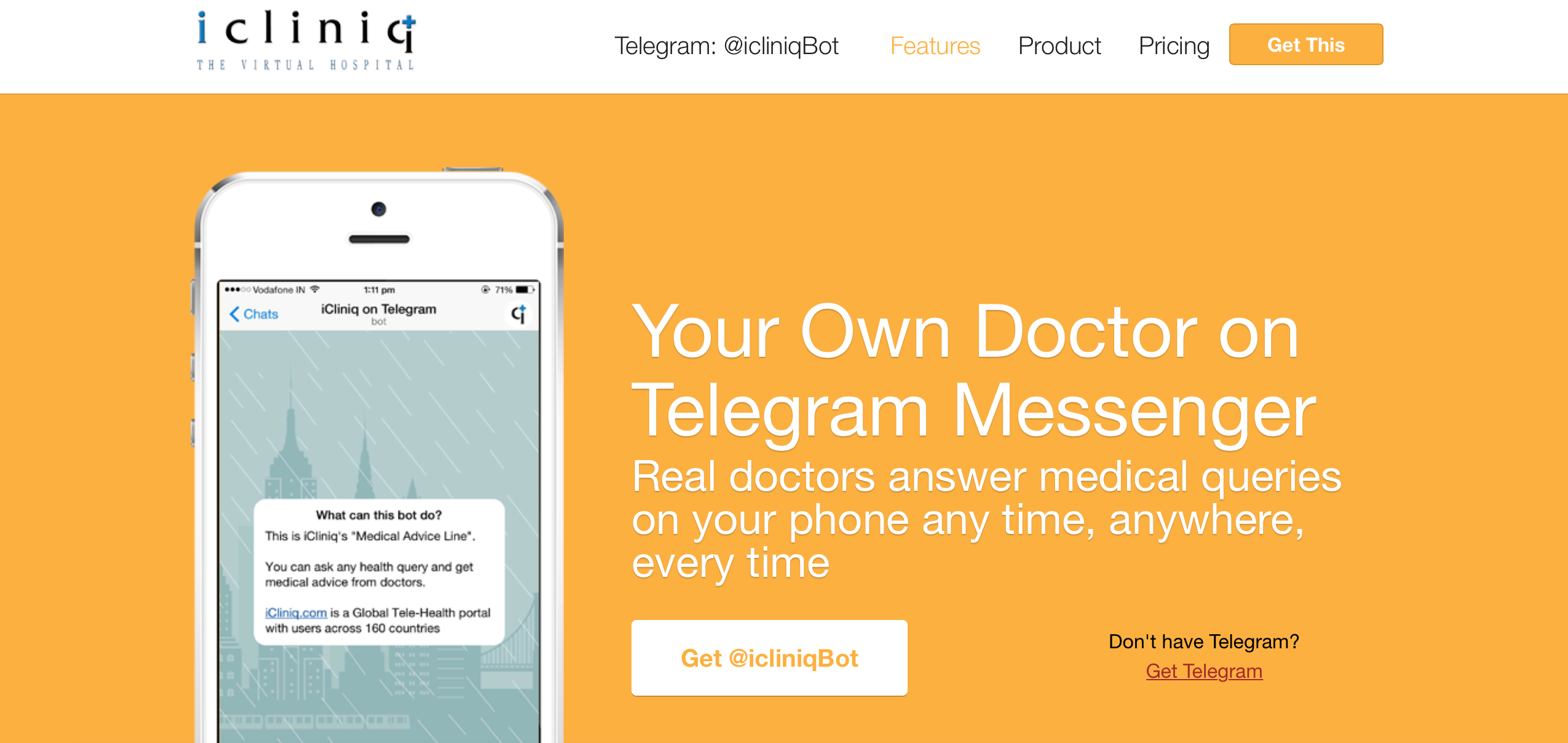 Telegram a Doctor makes it super easy for you to get expert medical advice. I'm starting to see a lot of these types of bots over the last few weeks.