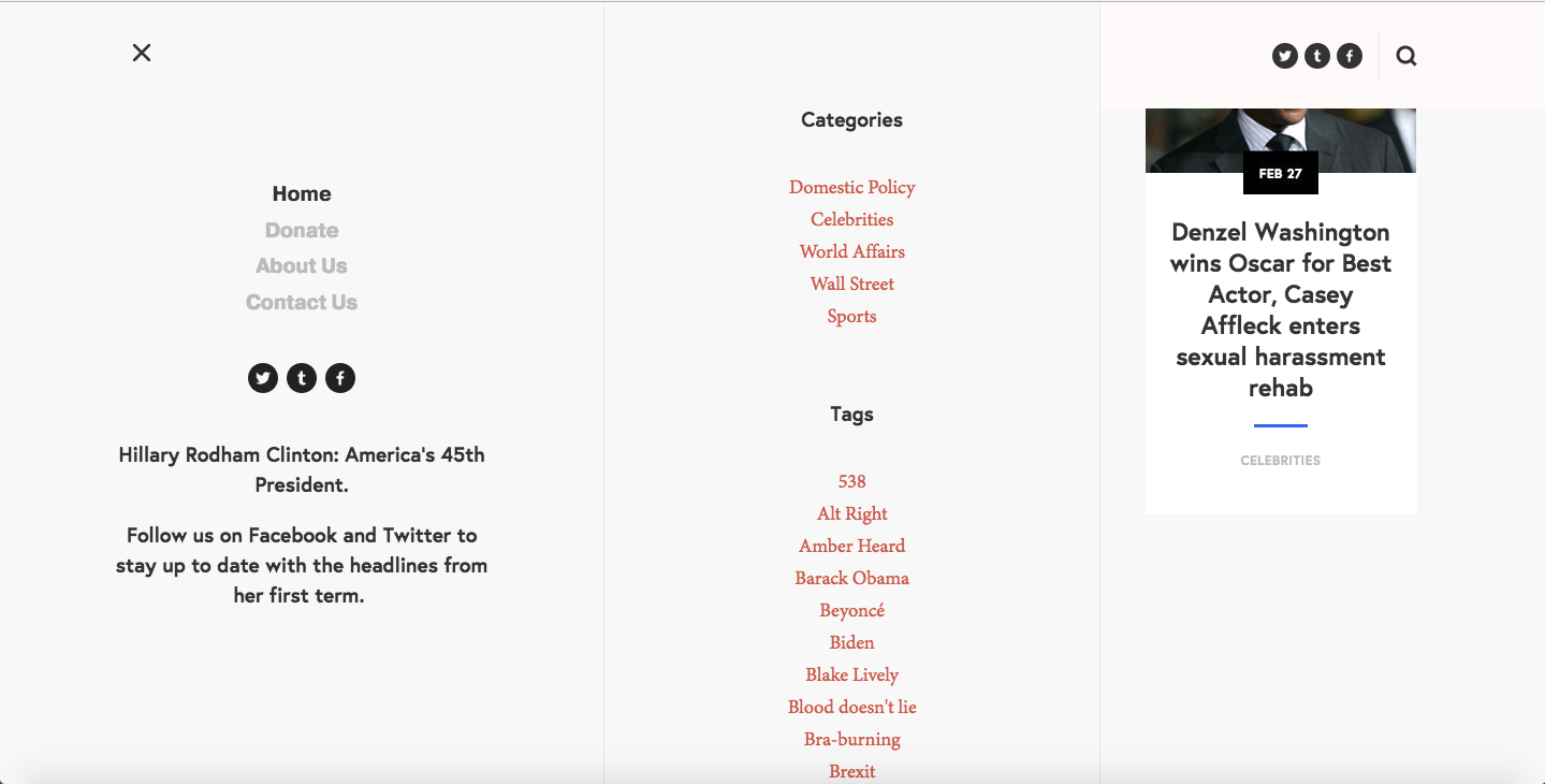 HillaryBeatTrump.org is a news site written as though Clinton beat Trump in the race to the White House, and is filled with tales of the former Secretary of State making bold policy moves and generally being the opposite of Trump.