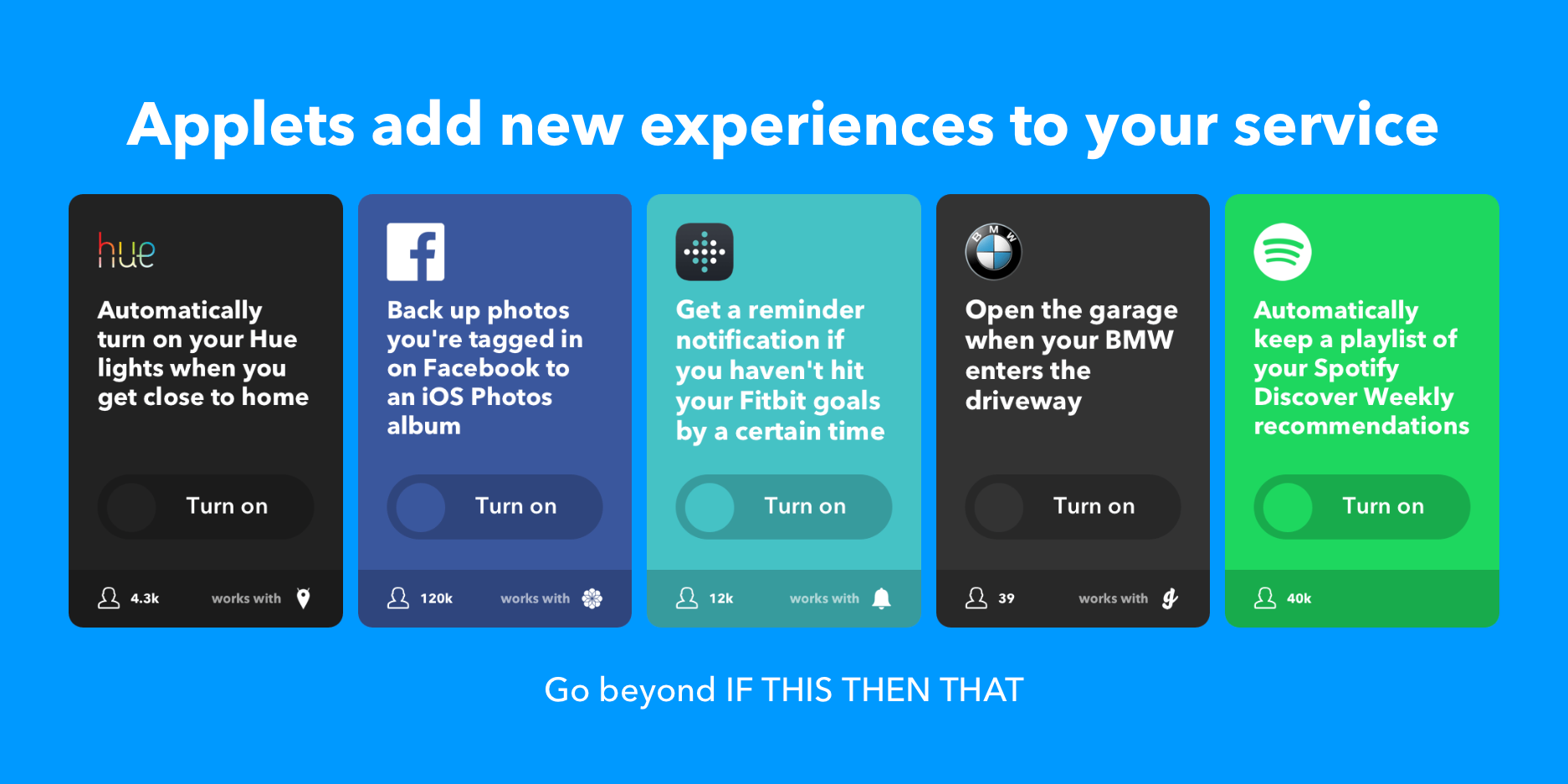 IFTTT Applets enable entirely new experiences made possible when your services work together in a way you can trust. We believe all service integrations—big or small—will eventually be possible through an Applet. As you invite any new service into your life, IFTTT aims to increase your confidence in that service being compatible with everything else in your … See more