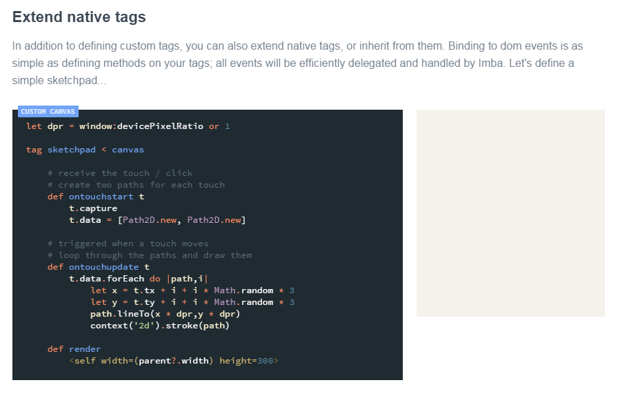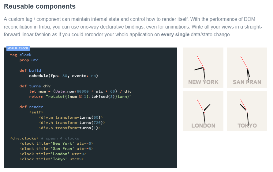 "Imba is a new programming language for the web that compiles to performant JavaScript. It is heavily inspired by ruby and python, but developed explicitly for web programming (both server and client). It has language level support for defining, extending, subclassing, instantiating and rendering dom nodes. For a semi-complex application l… See more