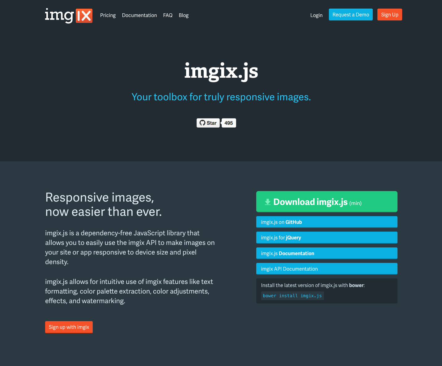 imgix.js is a dependency-free Javascript library that allows you to easily use the imgix API to make images on your site or app responsive to device size and pixel density.