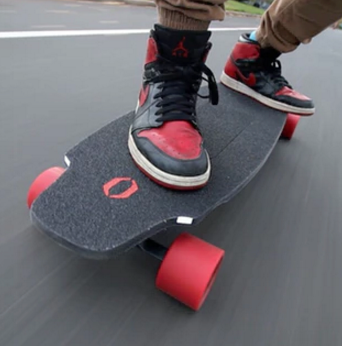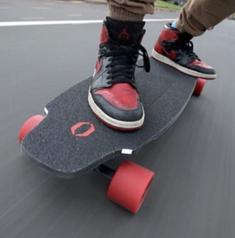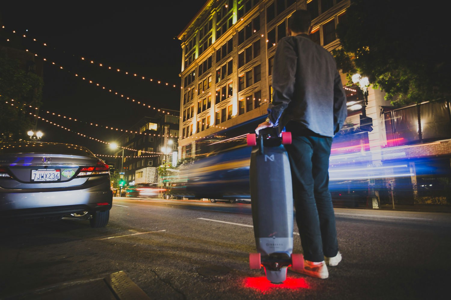 A new electric skateboard that combines in-wheel motors, a battery you can swap in seconds, and integrated LED lights.