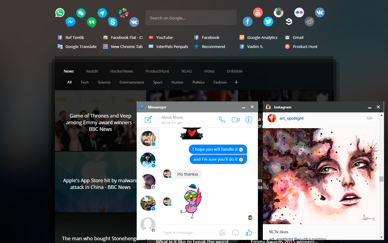 My Chrome extension can help you to talk in messenger apps and browse through social media directly from your default Chrome Tab. This extension supports: Facebook Messenger, WhatsApp, Skype, Hangouts, WeChat, Telegram, Slack, VK, Facebook feed, Twitter, YouTube, Instagram, Gmail, Reddit, Flickr, VK, 9GAG, HackerNews, ProductHunt, Dribbble.