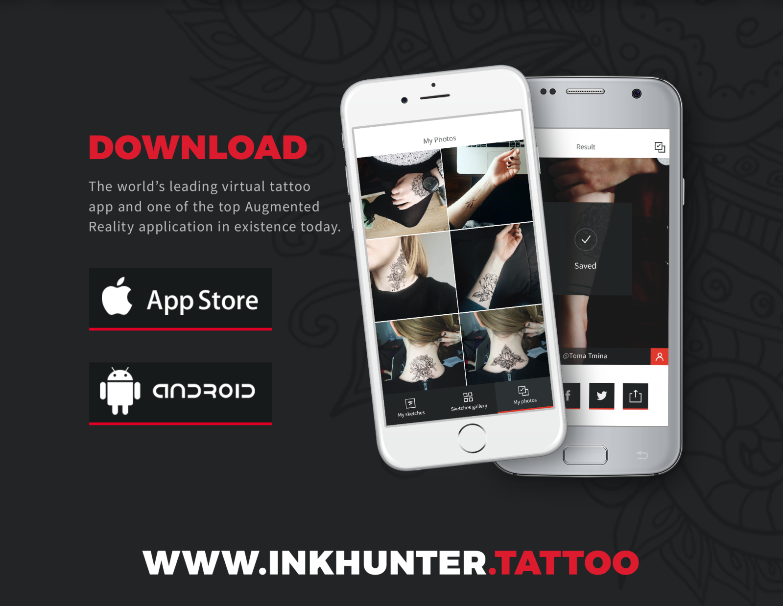 Just released for Android. Try on virtual tattoos with augmented reality before it’s inked forever. The app projects any tattoo design, on any part of your body to let you see how it will look.