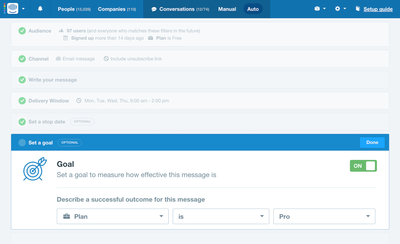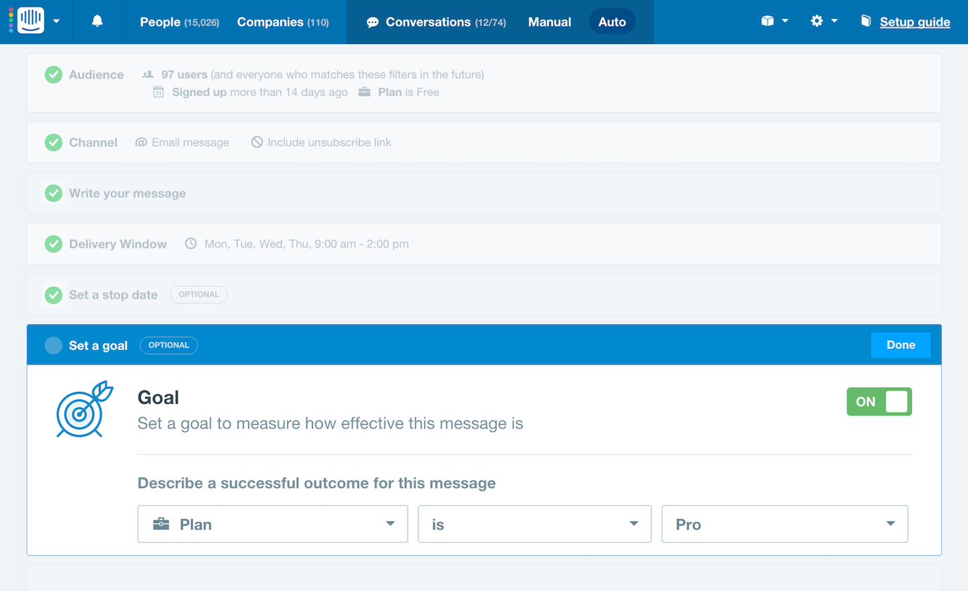 Opens and clicks only tell you so much. Message Goals let you see the true impact of every message you send in Intercom. You can set any event, or change to a user, or company attribute as the goal for an email or in-app message–installs, upgrades, any… See more