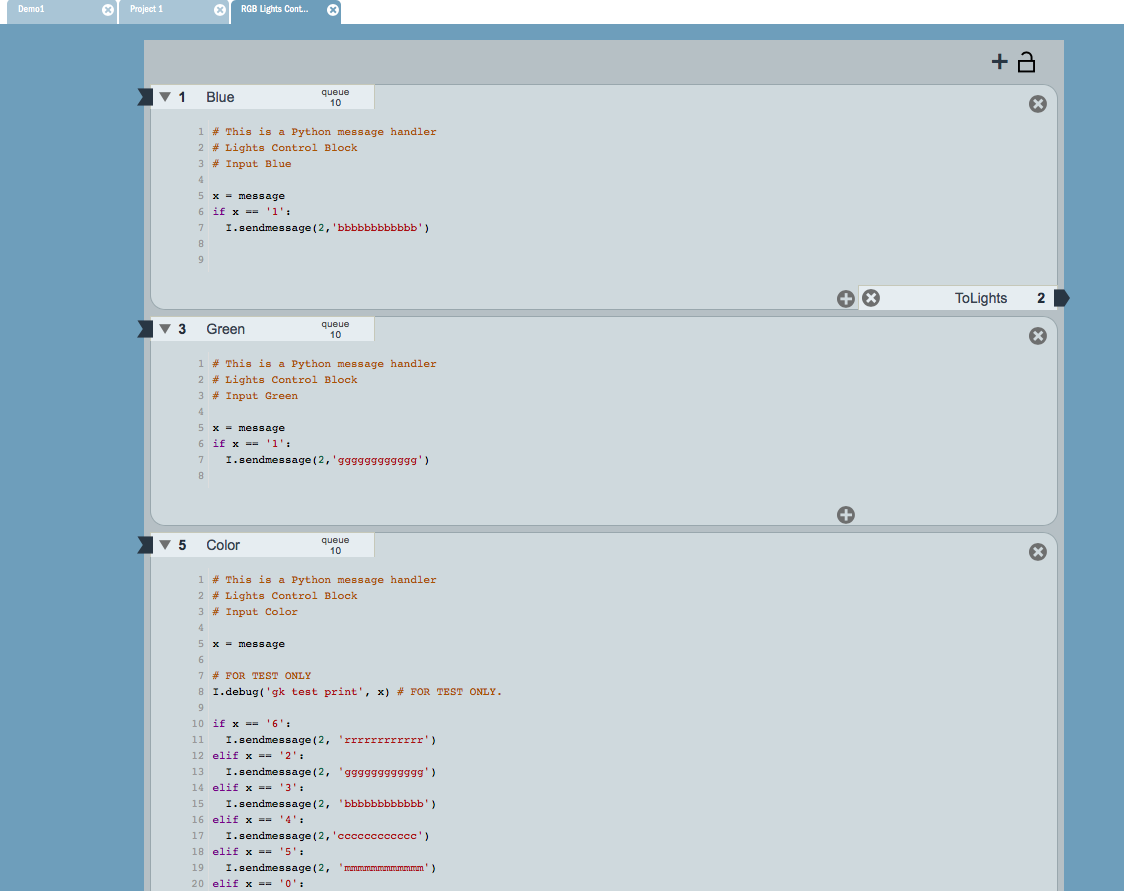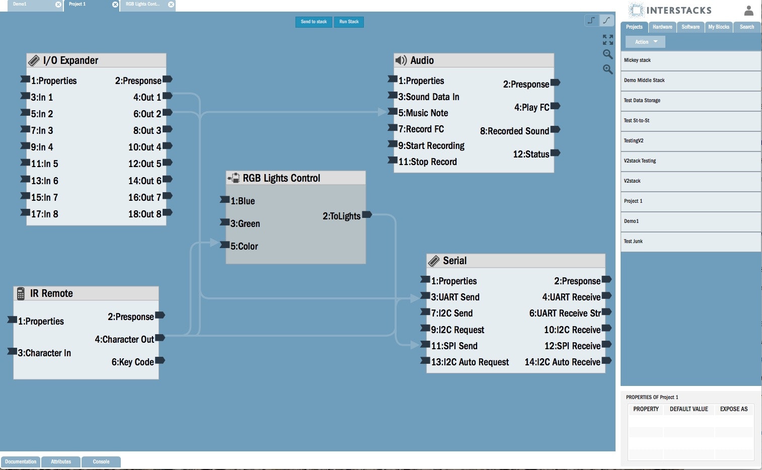 Pick the hardware blocks you want, snap them together, then use the free drag and drop authoring tool to draw lines between the inputs and outputs of blocks. You can also add software blocks written in the Python programming language to your stack’s blueprint. Press send-to-stack in the authoring tool on your laptop and the blueprint is sent over the USB cable to be stored in the stack. Twelve hardware blocks available so far, including motors (DC, stepper, servo), serial interfaces for sensors and small displays, analog and digital IO, audio, USB keyboard, infrared remotes, Wi-Fi, and lots more in the pipeline. Stacks can discover each other and messages can flow peer-to-peer between stacks. Interstacks doesn’t use shared IO lines but serial message busses, so you can add as many blocks of the same type as you want.