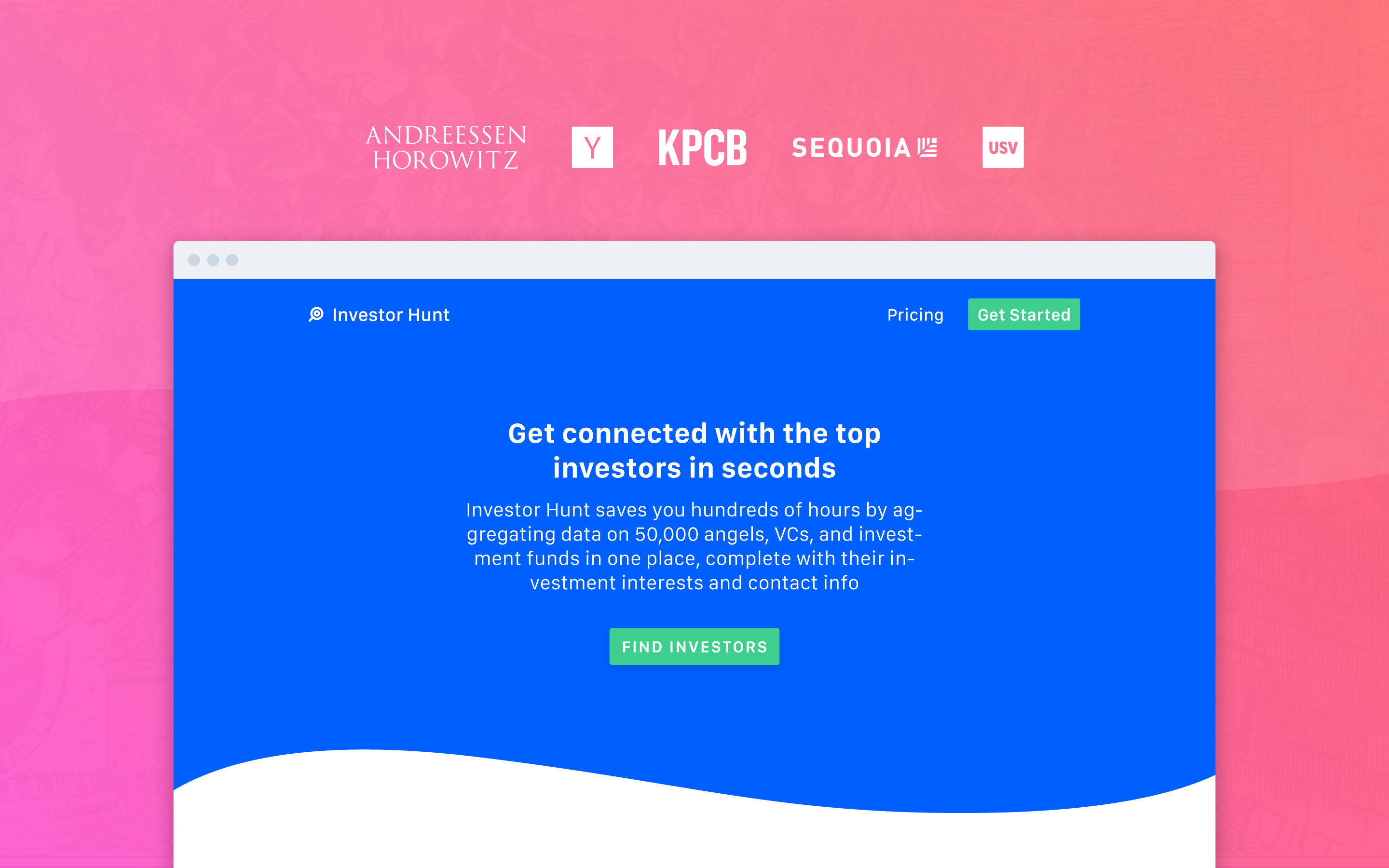 Investor Hunt is a database of 40k+ investors that saves you hundreds of hours of research on AngelList, Crunchbase, and LinkedIn trying to find the right investors and their emails.