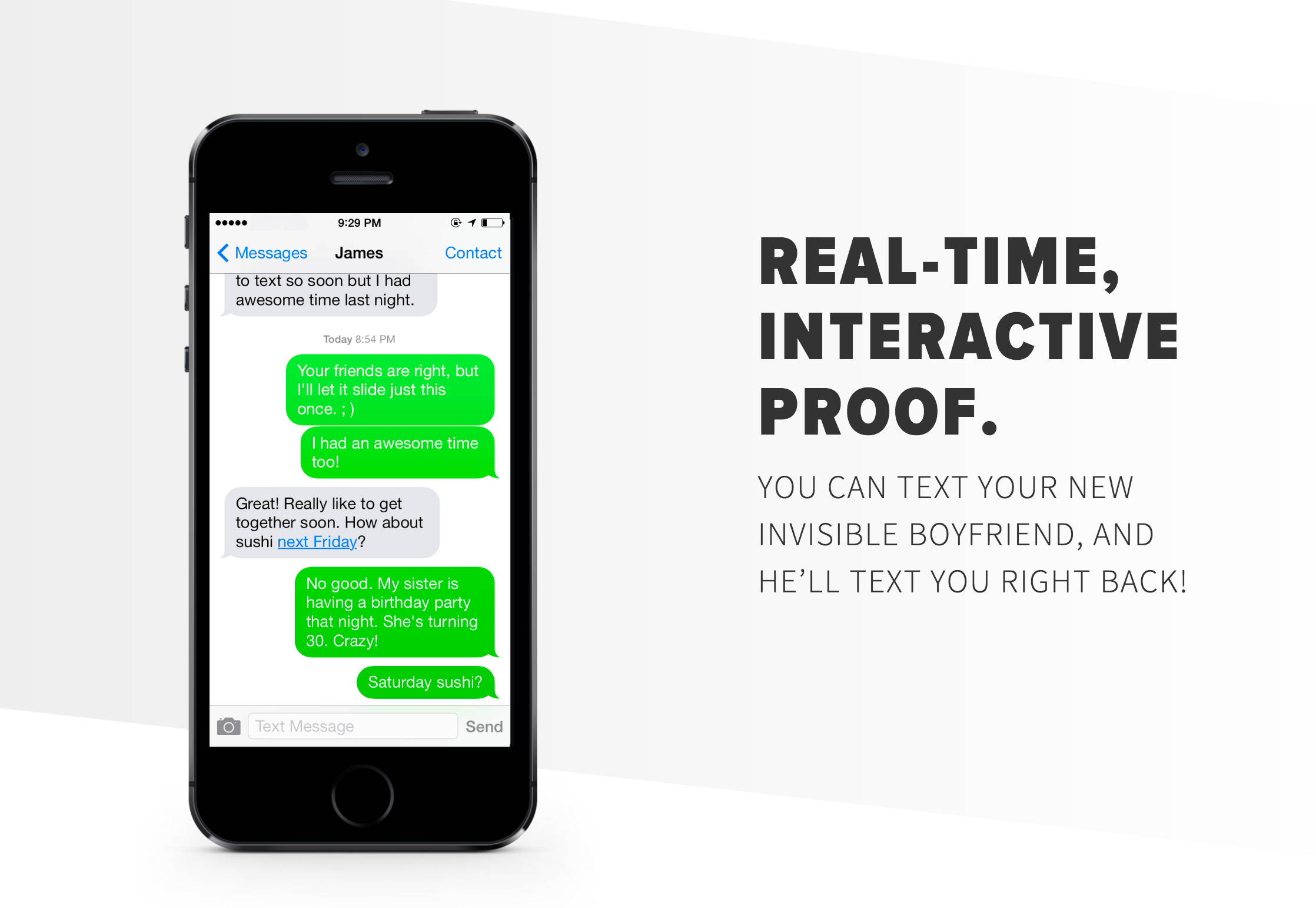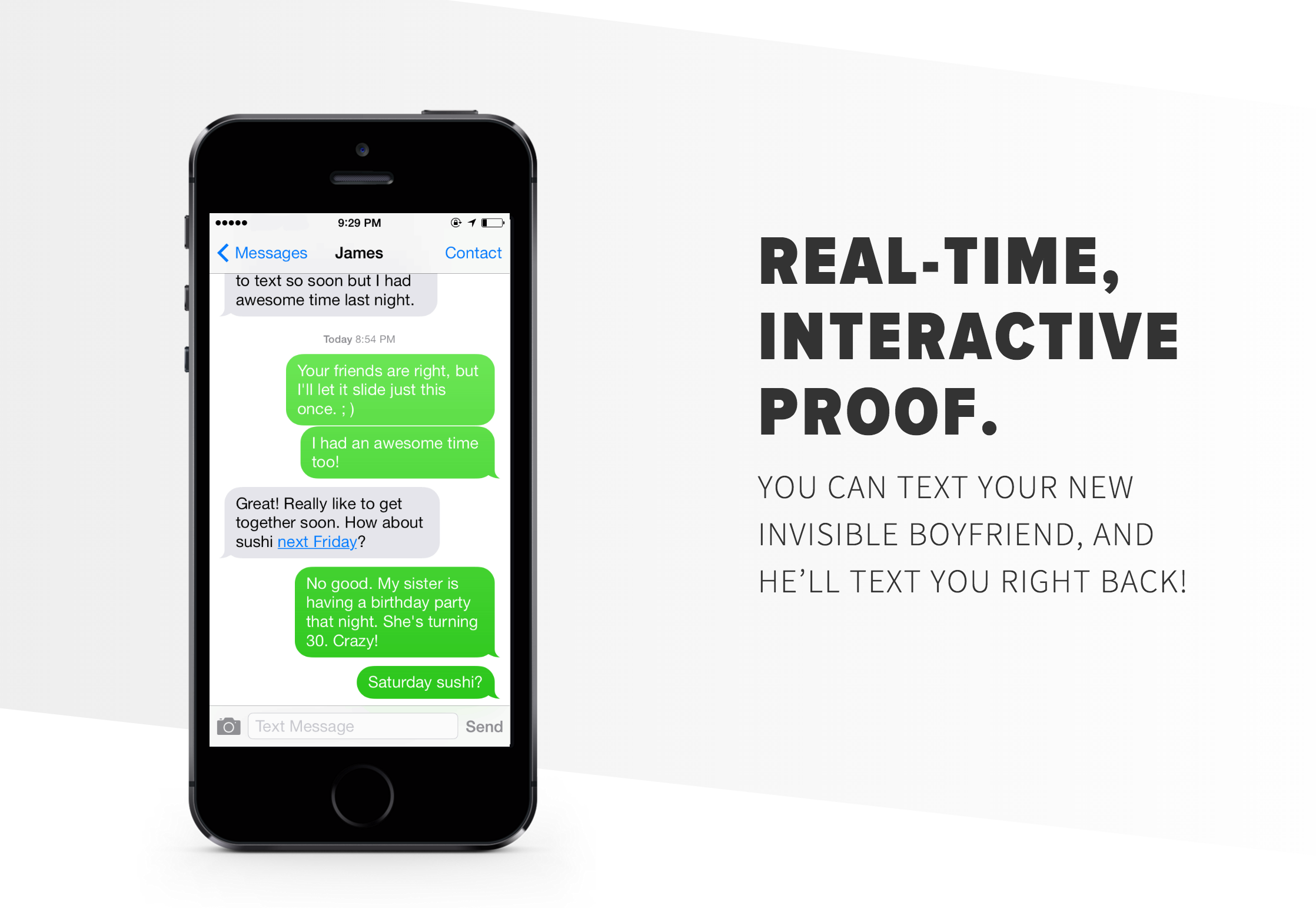 Invisible Boyfriend gives you real-world and social proof that you’re in a relationship - even if you’re not. Launched by the same team behind Invisible Girlfriend