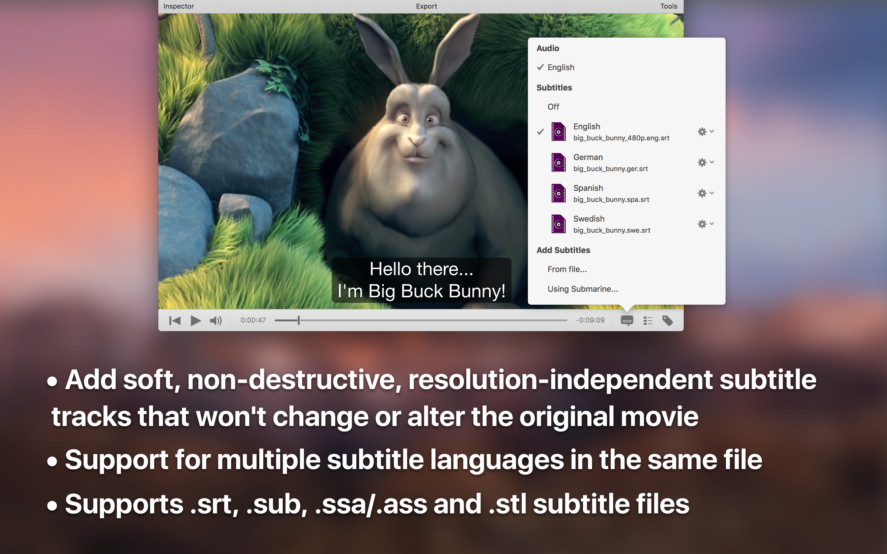 Inject subtitle tracks, chapter markers and metadata into your movies and TV-shows. The perfect companion app for your iTunes library and all your Apple devices, like the iPhone, iPad, iPod, Apple TV and Mac. iSubtitle takes full advantage of Apple's soft subtitle technology.