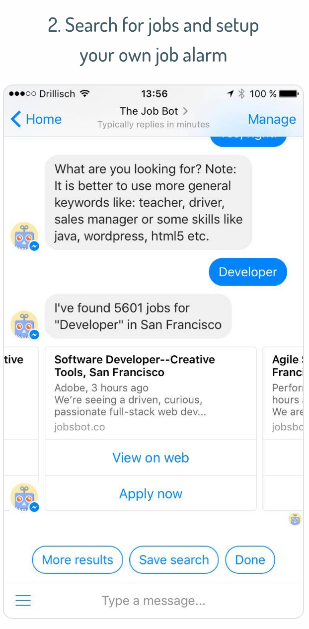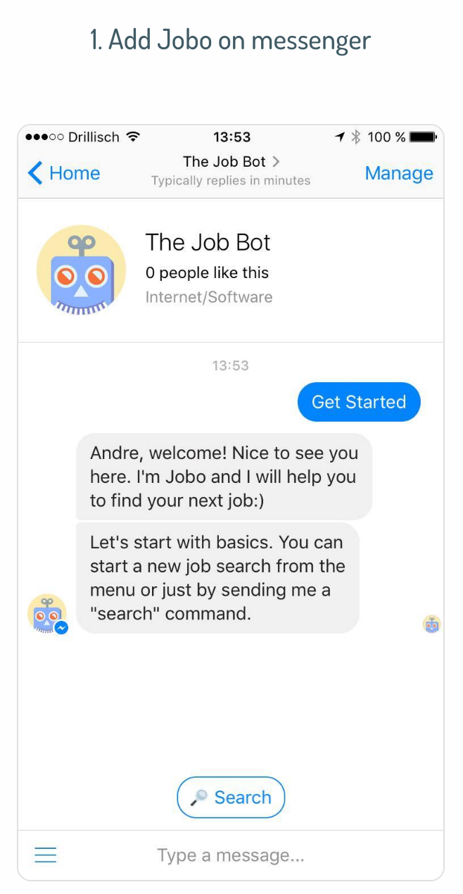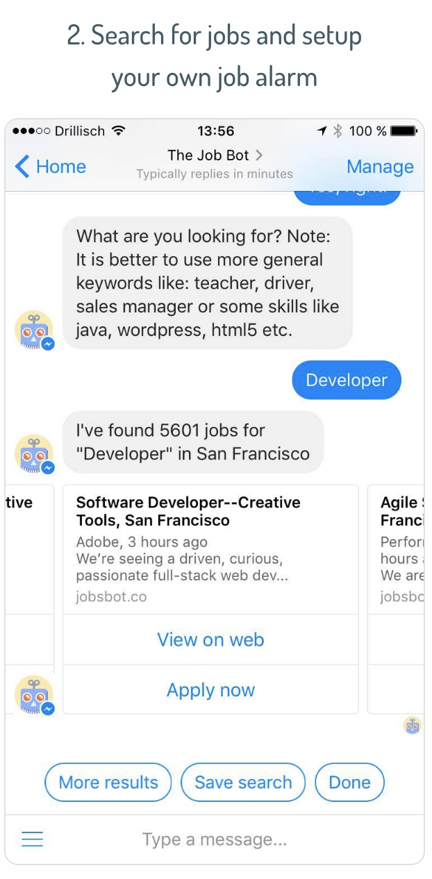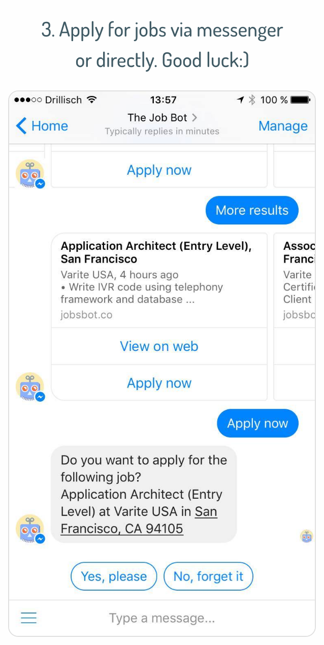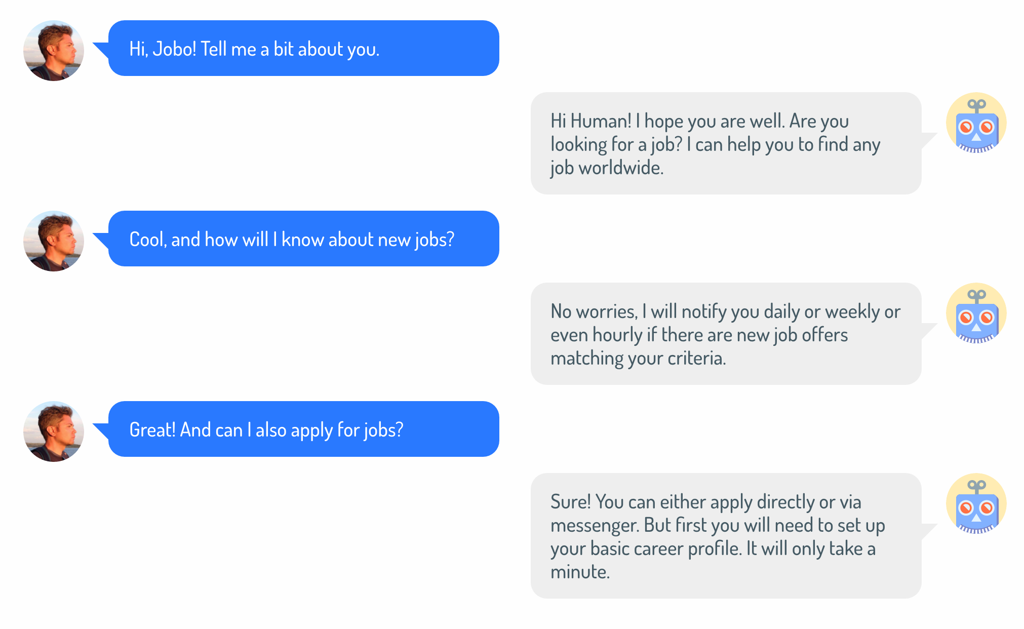 Hi, Andre from JobBot here. @thejobmarley thanks for submission. We planed to do it soon after release of the new version. @abdussamit We are currently working on new features for candidates and recruiters as well. The bot is going to be much more smarter and funnier ;) For the moment more than 100K messenger users tried out our bot and almost 50% of them su… See more