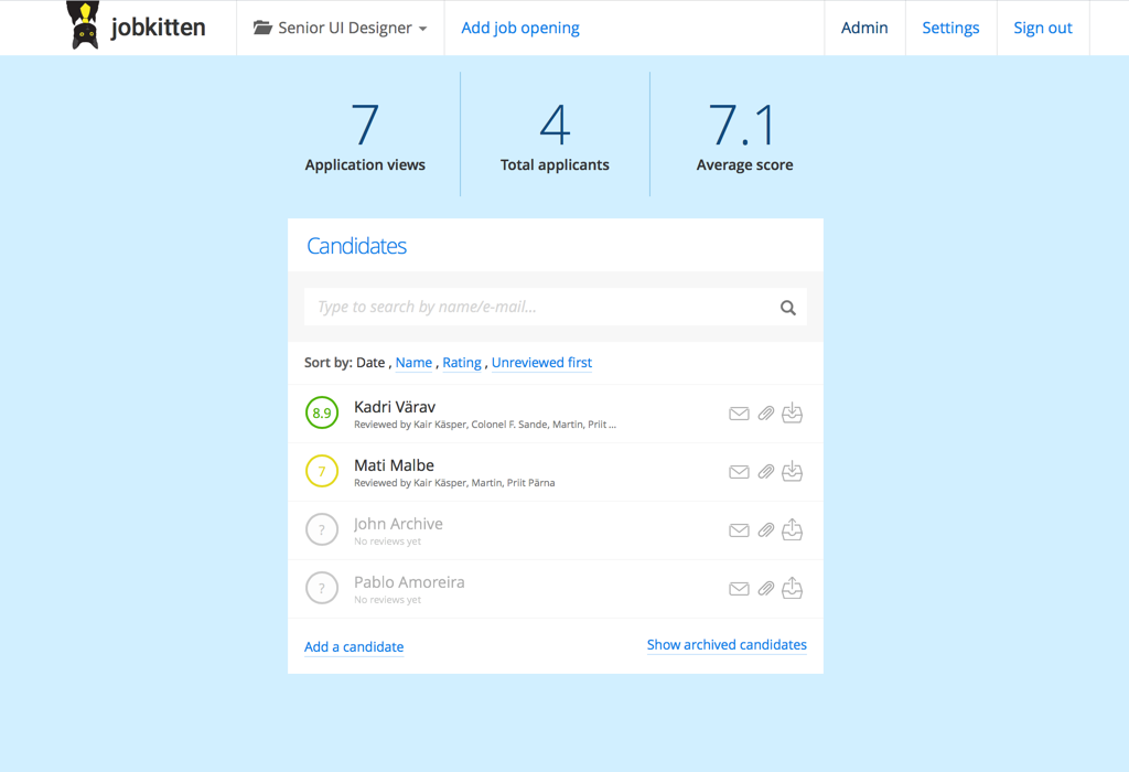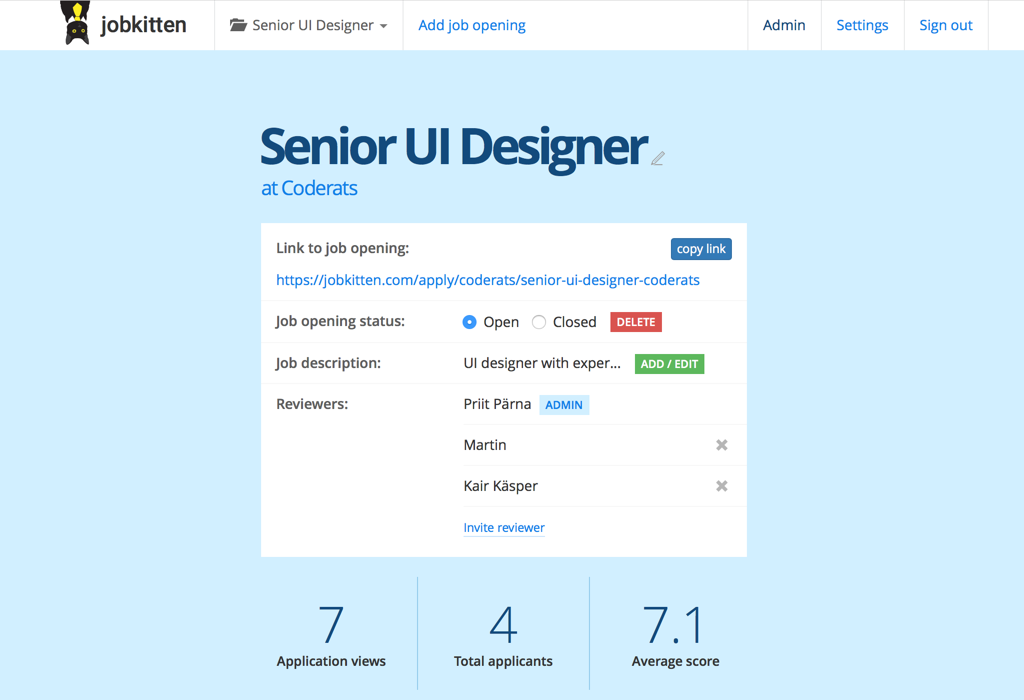 Jobkitten lets you post jobs, process applications and that's all it does - hence pricing from 2,9 €/opening.