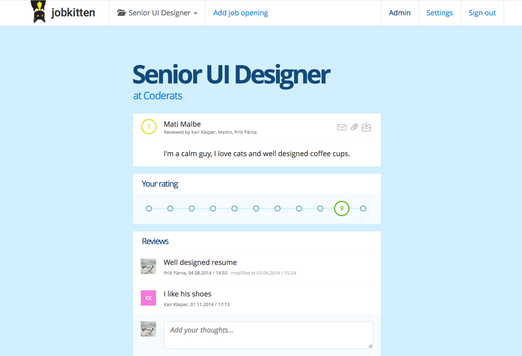 Like many business tools, Jobkitten started purring out of personal necessity - we got sick of bouncing resumes and comments around chat and e-mail.