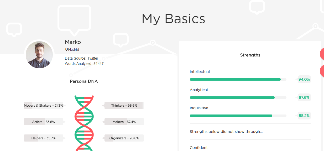 Juji is anylizing the words in tweets and forming basic, professional and relational profile.. It's a bit creepy though :) But I think it's useful especially for brands to get an idea about the personality of their brands..