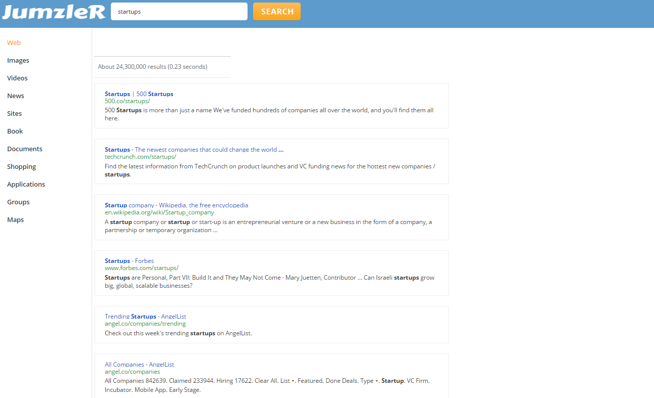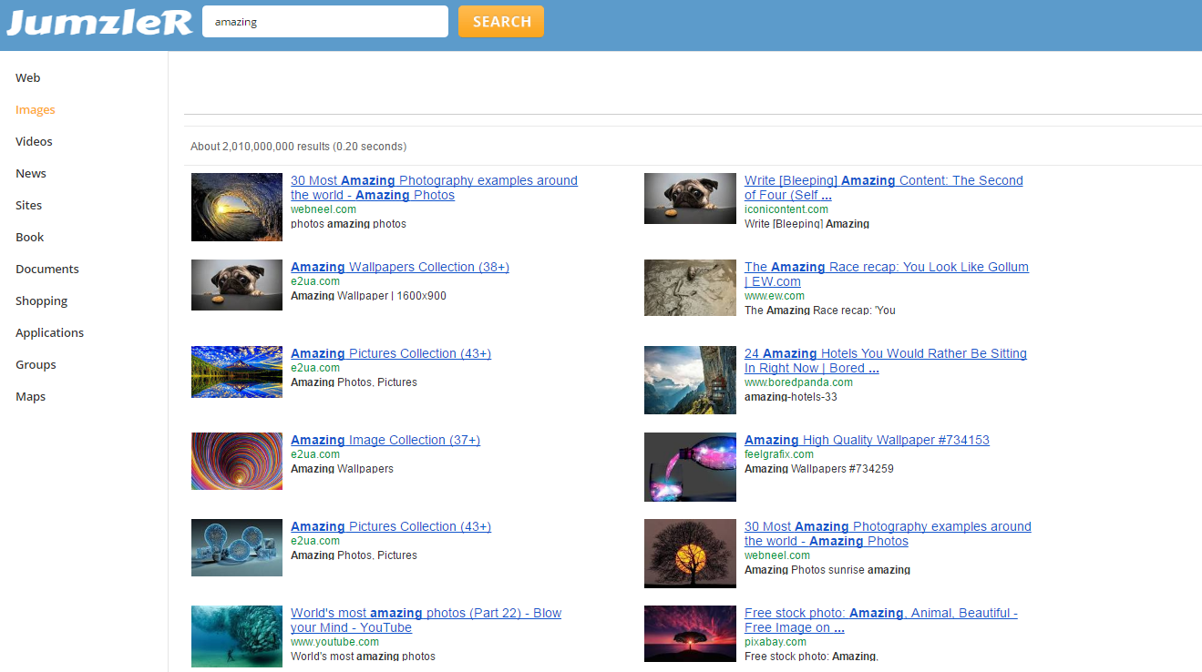 We're very excited to announce the improvement of JumzleR from a social network to a search engine allows people to search their interests using 11 different search filters, we treat each filter as a search engine with very high quality results to help you search professionally.