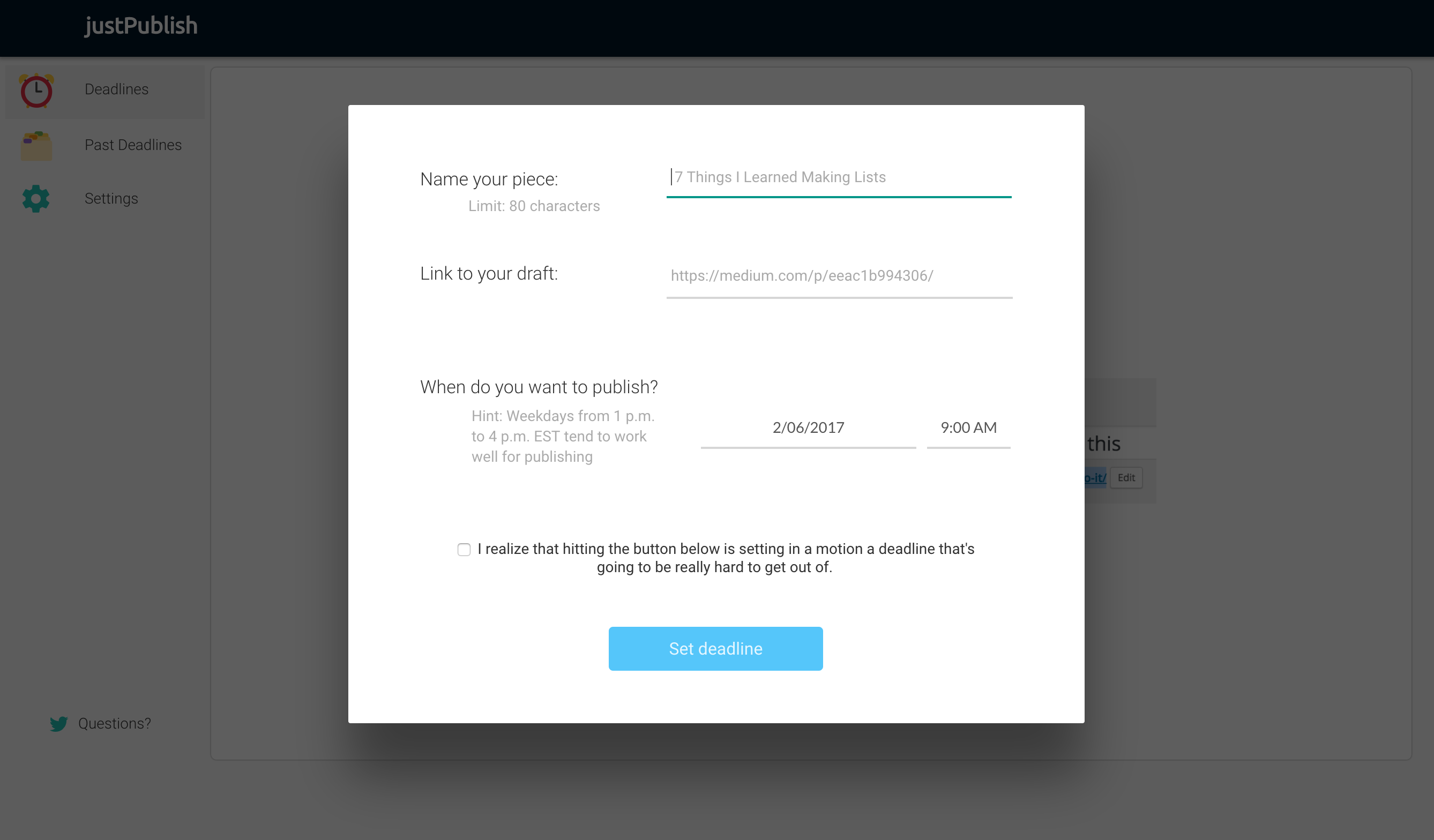 the number of projects I have started that haven't seen the light of day...countless. This is really cool, have you thought of adding in features to maybe track your progress before the deadline? Or is this more for an all or nothing approach?