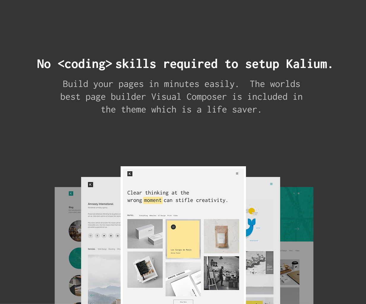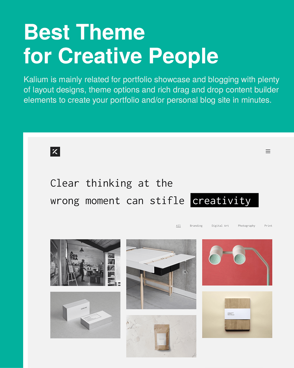 Kalium – its a creative WordPress theme mainly related for portfolio showcase, blogging, selling your items etc. It has plenty of layout designs, rich theme options and drag and drop content builder elements to create your portfolio and/or personal blog site in minutes.