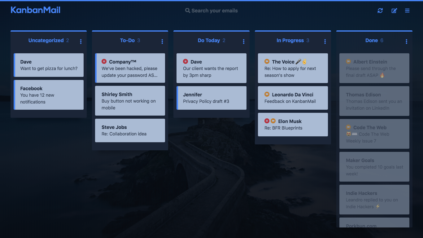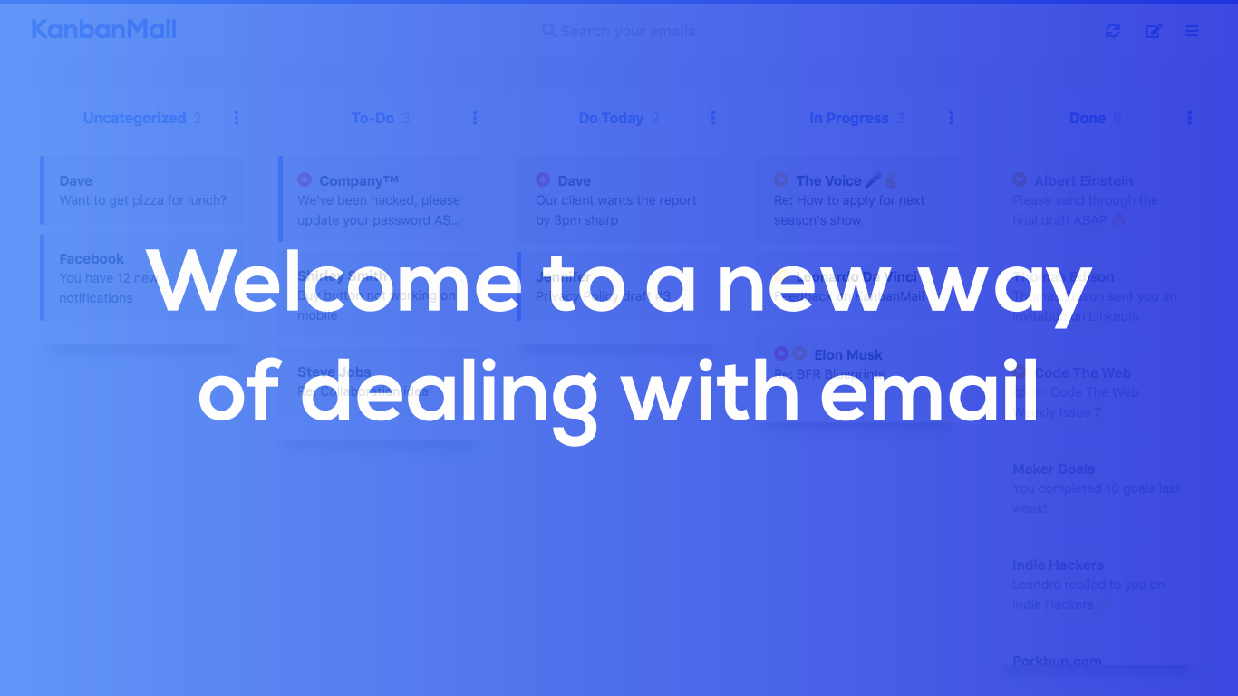 A Kanban board is designed to turn a confusing list into a clear action plan by visualizing it in columns. And what's the most confusing and daunting list there is? Your inbox of course! This is exactly why I made KanbanMail. It's really helped me tackle my email, hopefully it will help you too!