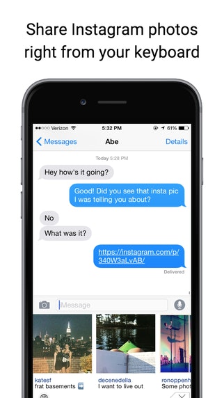 It looks pretty interesting! It's like a short-cut / plugin for a keyboard and the fact that you can like and share from there, it's amazing. But, would it be possible to share the picture like a screenshot instead of a link? It would be probably be better for users and it would cut the task of being directed to instagram... just a thought. Still a great ide… See more