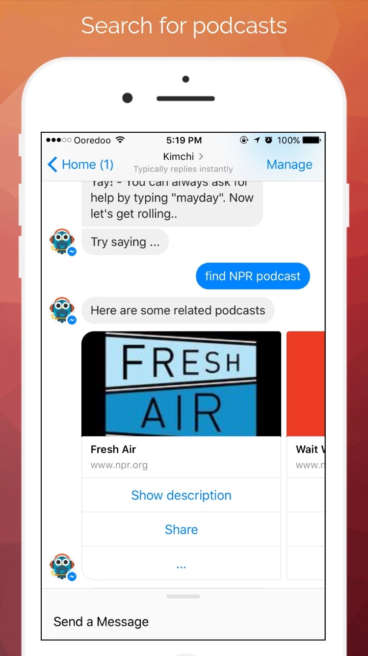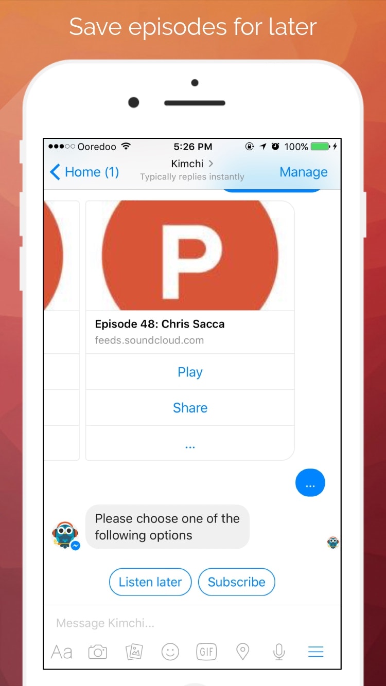 We've built a library of 200,000+ episodes that you can access and explore right from Messenger, you can subscribe to podcasts you like, save episodes for later, share episodes with your friends, and of course get notified on new episodes from y… See more