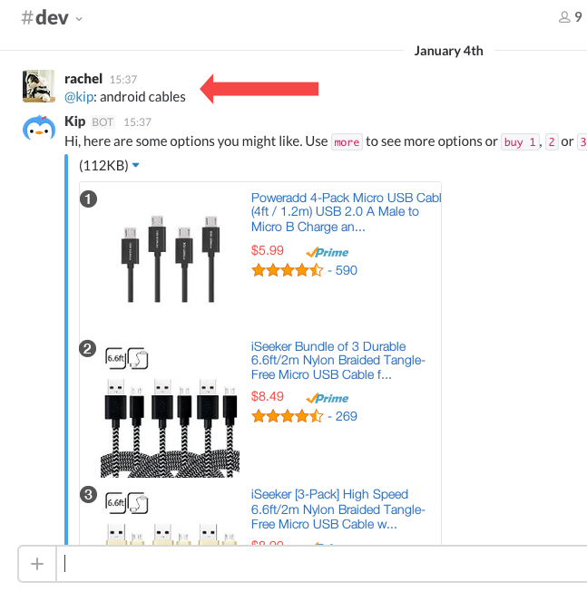 Hey Kip team! Lots of us are building bots for Slack on the most basic and predictable use cases and here you are, with an idea that opens up the possibilities for many other applications! Well done, and as your helpful article on Medium (https://medium.com/@kipsearch/ho...) which we've taken helpful notes from shows, you've really thought through and optimi… See more