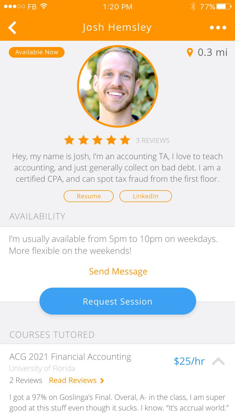 I would have definitely used this in college. UX and UI is spot on, super easy to use. Like uber for tutoring.