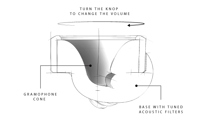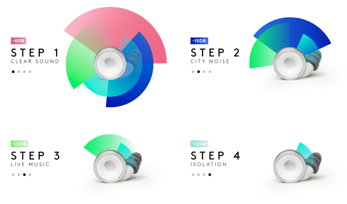 Knops is an analog acoustic and adjustable hearing solution. The earplugs look and work like a volume button and have four steps in which you can adjust the volume. With the first step you hear clear sound and then there are three steps that filter 10db, 20db and 30db (indicative).