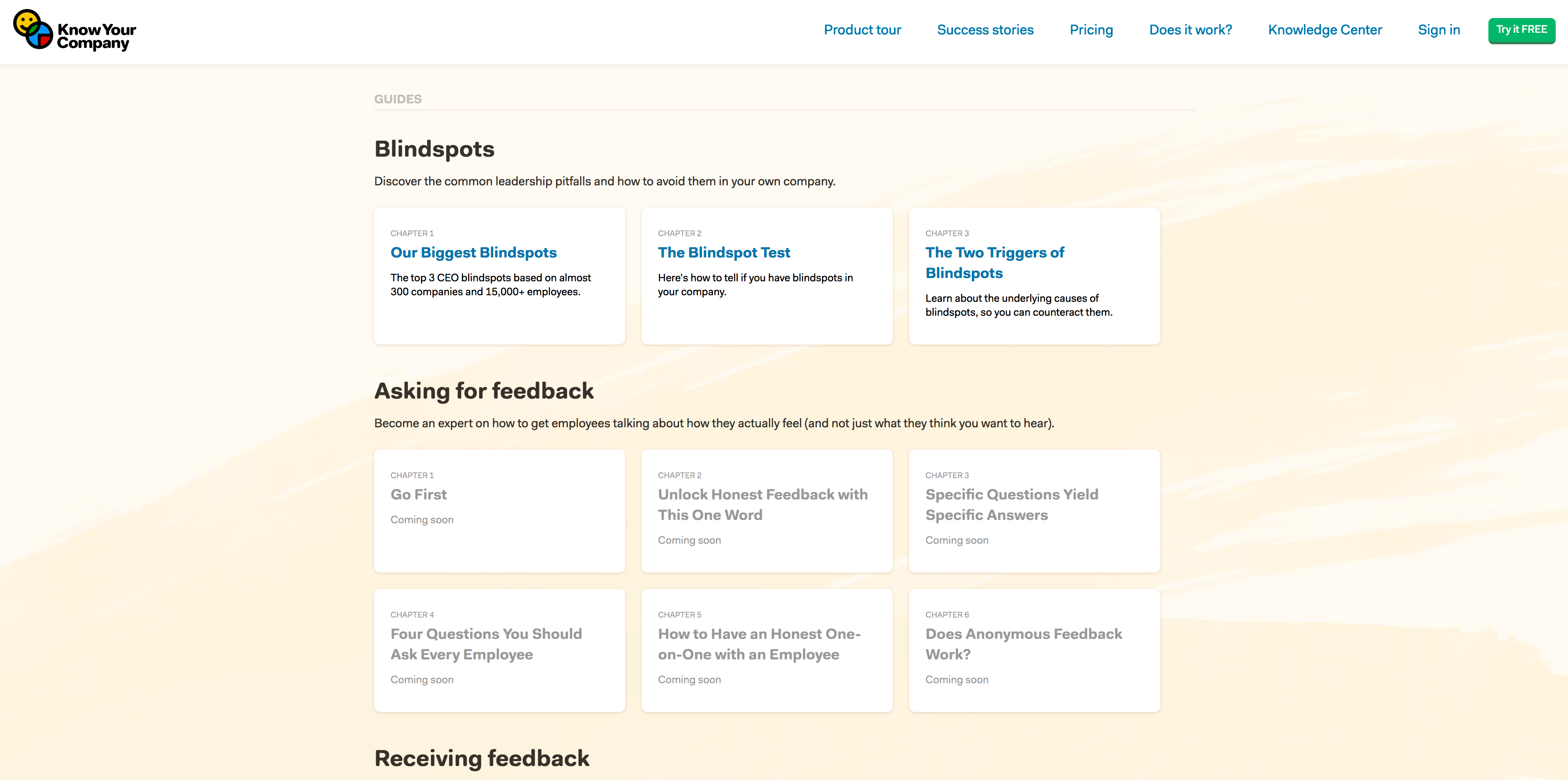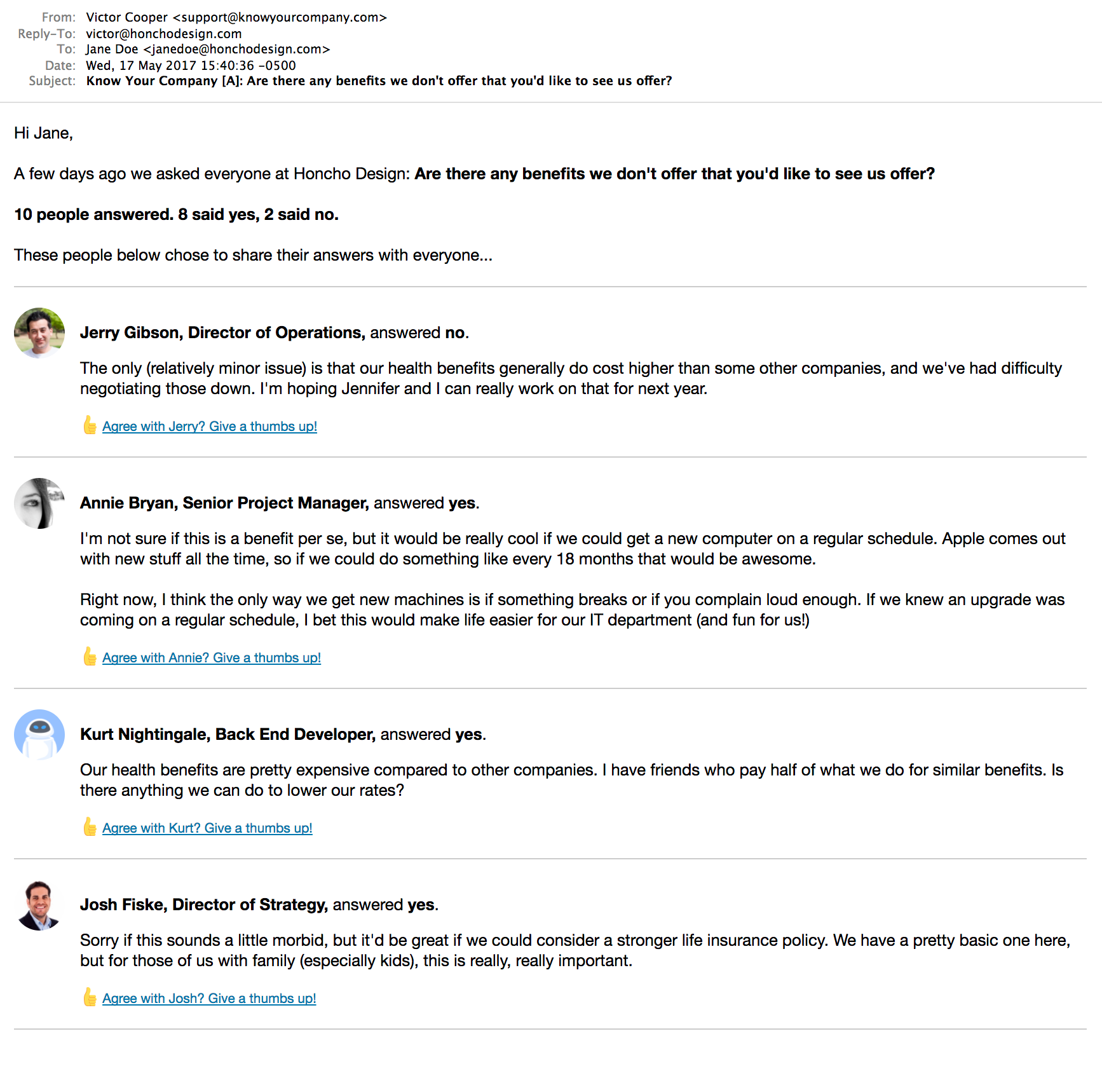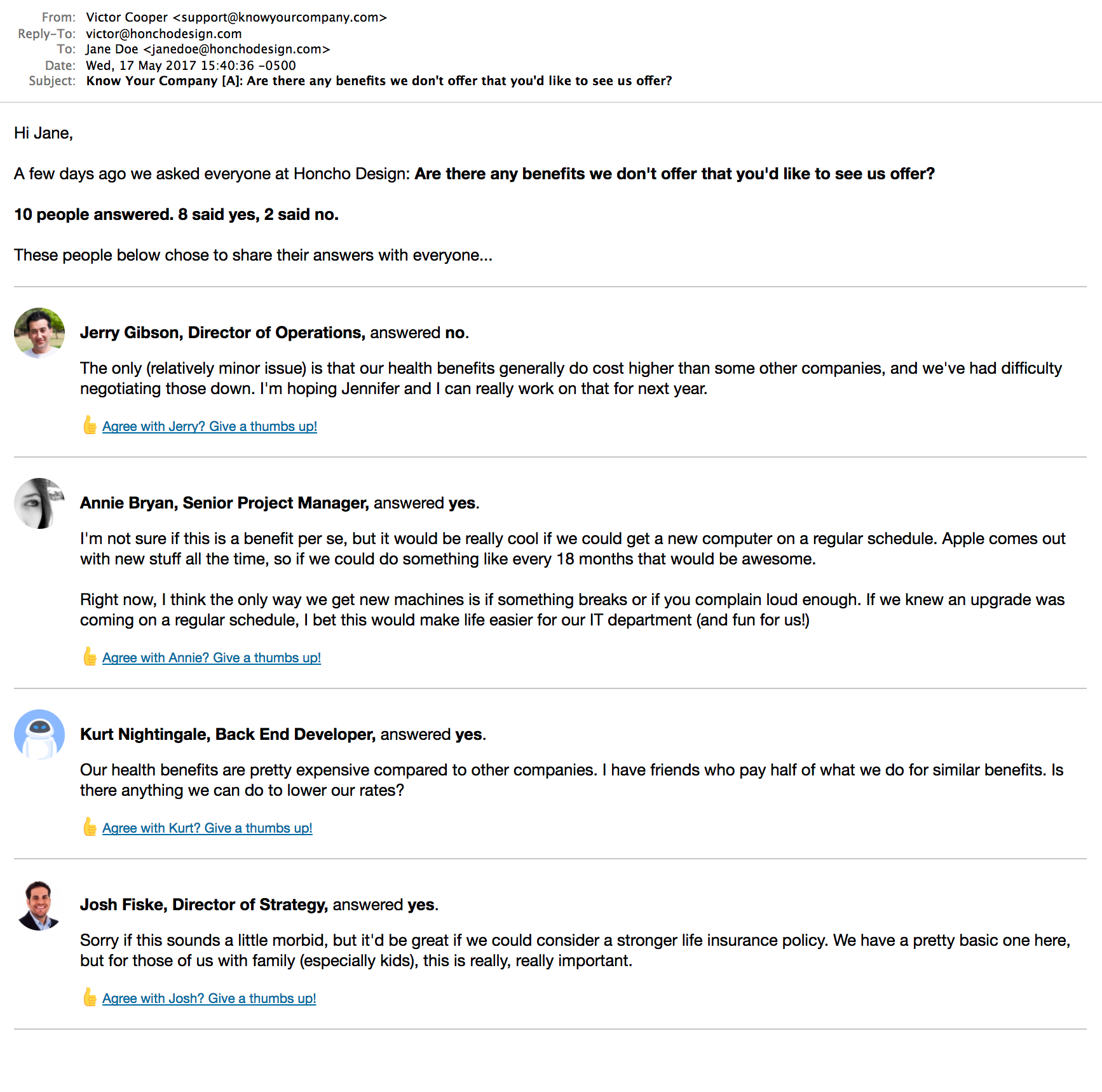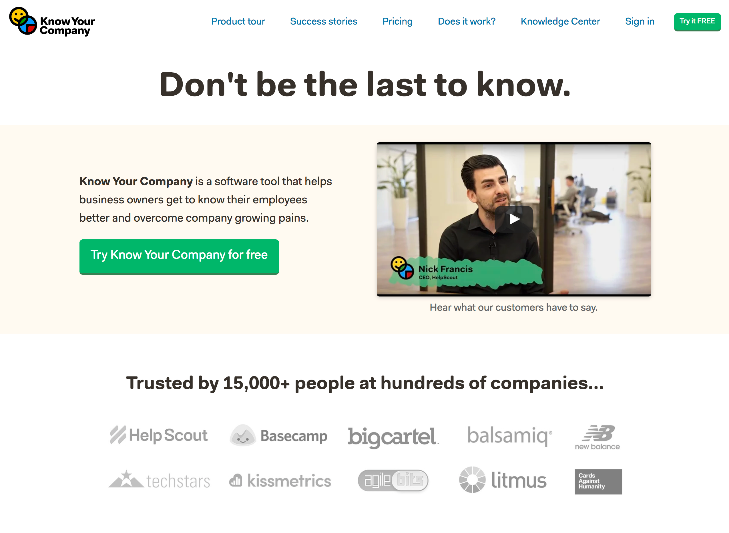 I'm Claire Lew, the CEO of Know Your Company, and I'm excited to share Know Your Company with y'all here (http://knowyourcompany.com). Know Your Company is a software tool that helps business owners overcome company growing pains and build an open, honest work environment.