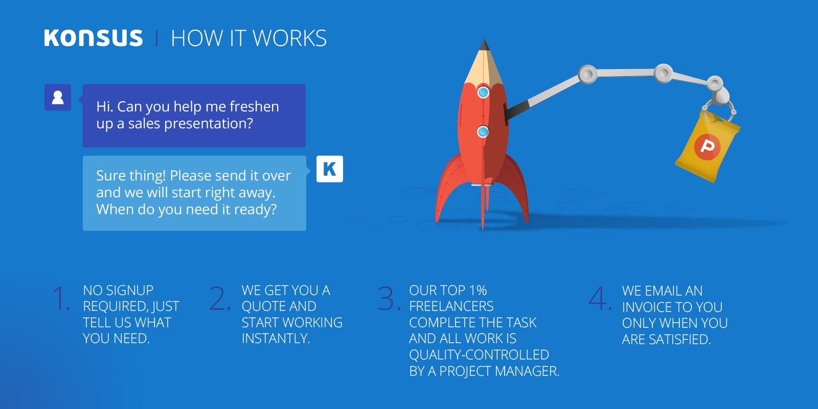 Hi everyone! I'm the CEO of Konsus. We provide On-Demand Freelancers for Business. Companies simply send us tasks via chat or email and then we instantly assign a freelancer based on skill and availability. Most knowledge workers spend a large portion of their day doing non-core work, such as polishing powerpoint presentations. We specialize in 10 common bus… See more
