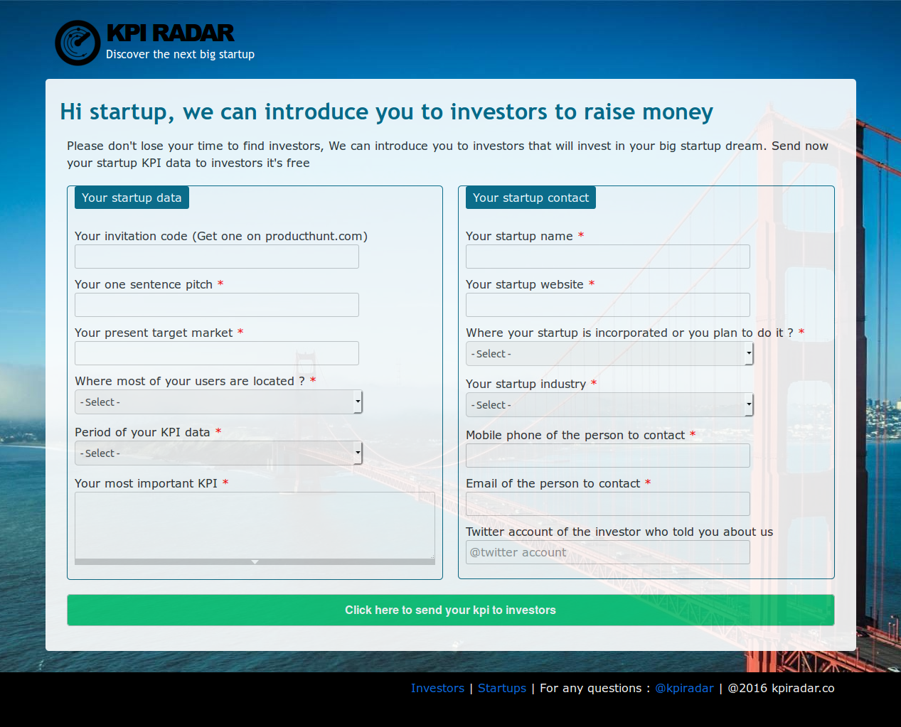 It's free for product hunt community and you are in direct connection with investors or startups (No middleman). Please use this invitation code to get access to KPIRADAR.CO