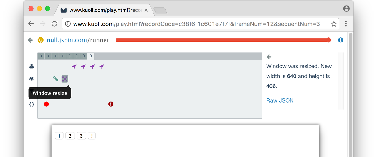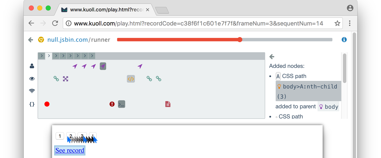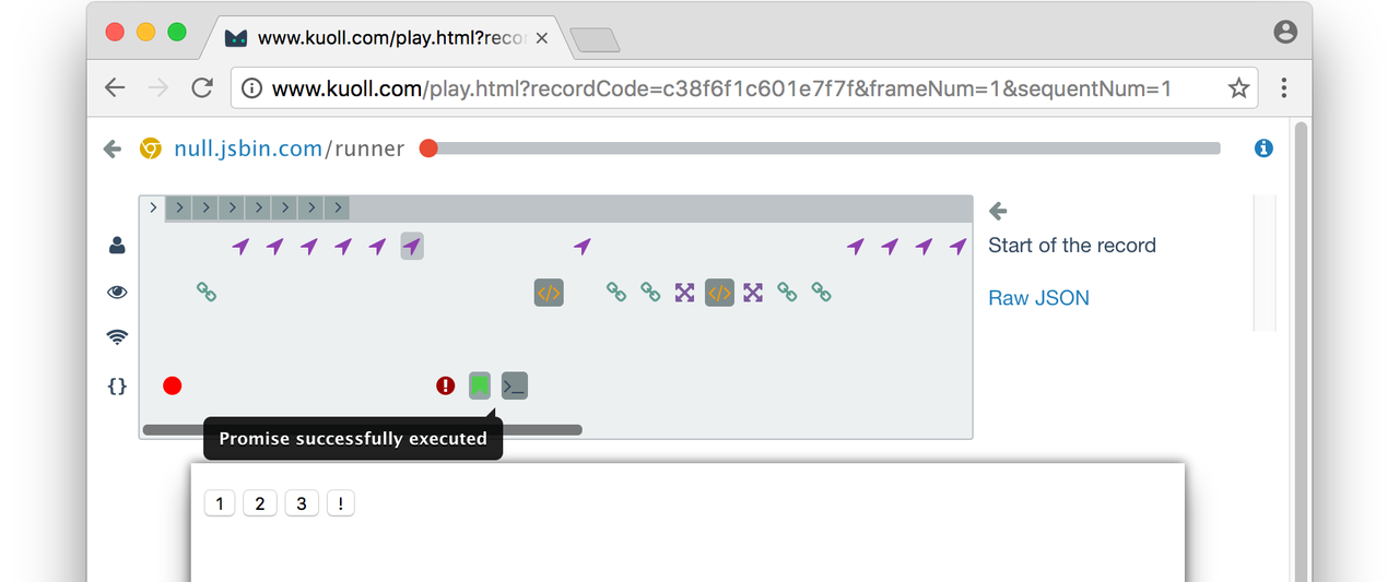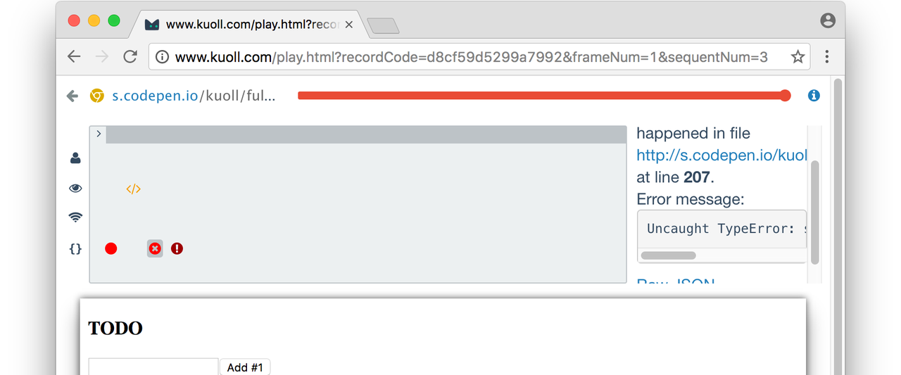 Kuoll is a remote debugging tracer for JavaScript web applications. Kuoll script wraps pages of your web application into an interaction listener. To enable you authentically replay UI, network, javascript and user events in your own web browser.