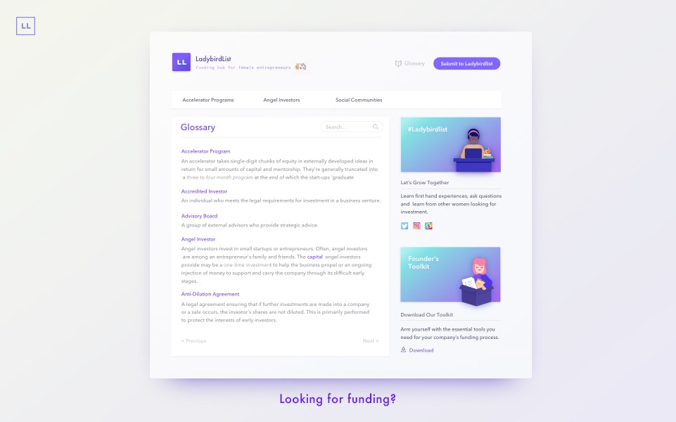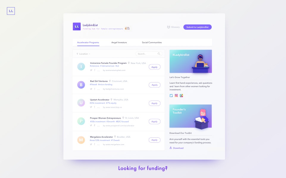 We aim to support female entrepreneurs on finding funding resources for their start-ups. Our product combines an up-to-date directory of funds, accelerators and network groups solely directed at women.