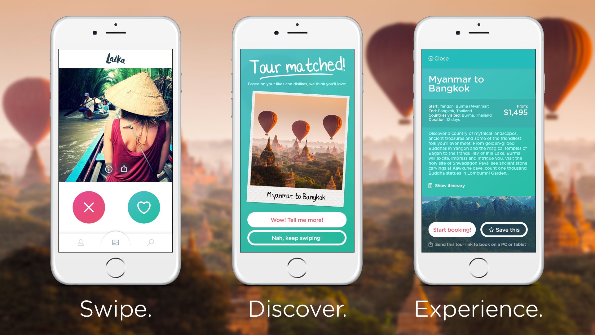 Laika will help you discover your next adventure by recommending incredible tours based on the travel photos you like, or don't like!