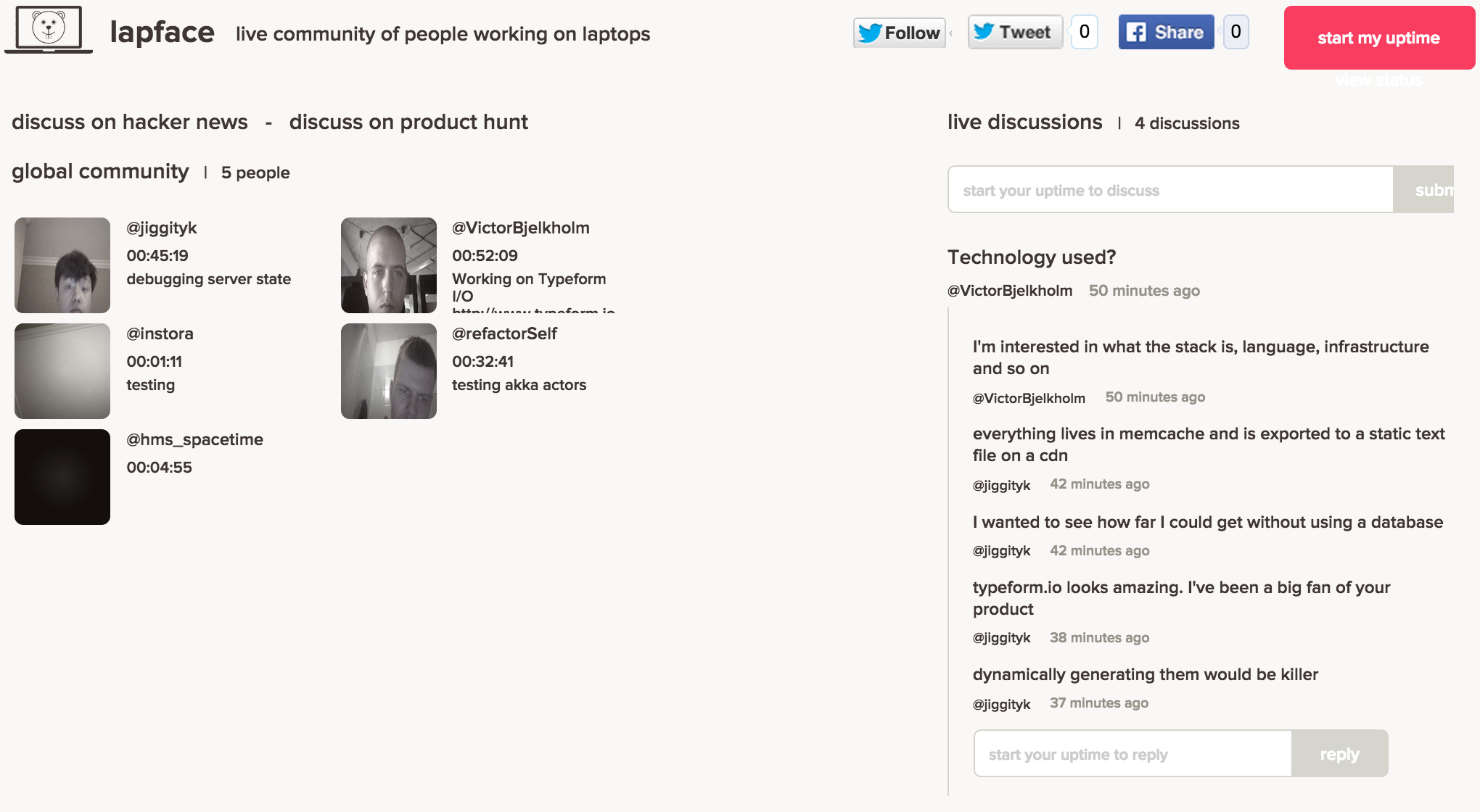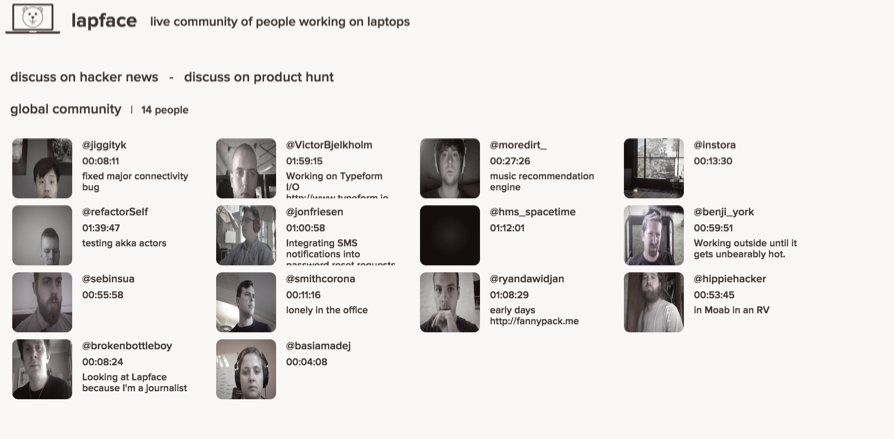 Lapface was my weekend hack designed to give the feeling of working with other people. It takes a low resolution webcam shot every 3 seconds of you working. I made the image with slow fps to relieve you of the pressure that usually comes with broadcasting.