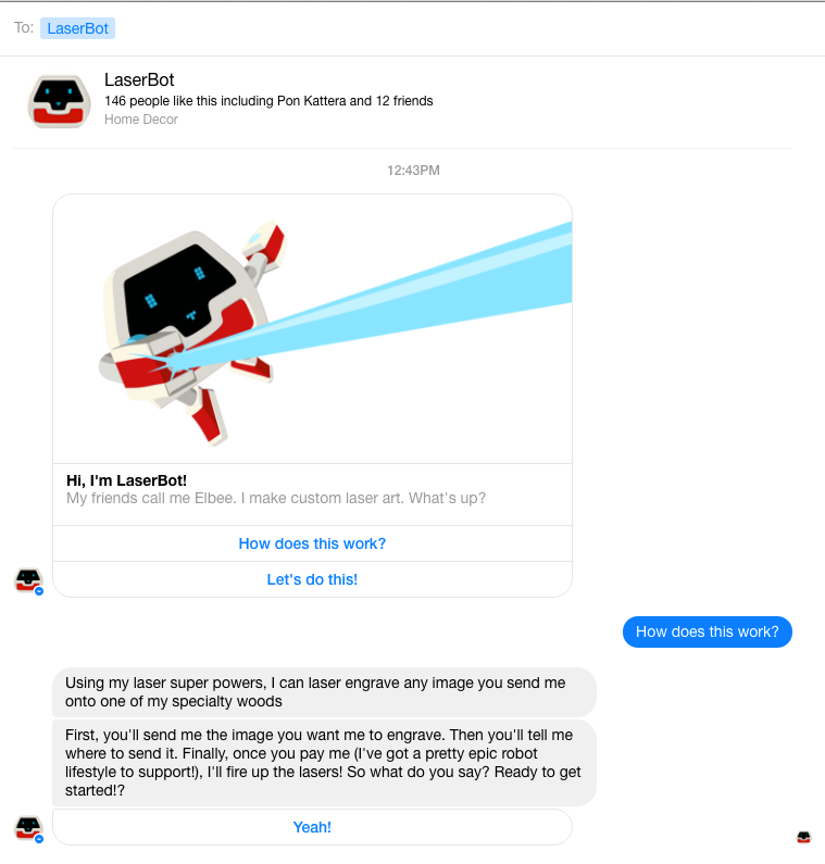 My friend @trevorkmarshall, who is multi-disciplined as an engineer/musician/and more, mentioned recently that he was building a better way to create custom laser engraved signs and artwork. To replace the typical ordering and proofing process he built LaserBot, a Facebook messenger bot that makes it super easy to upload images, handle payments, and of cour… See more