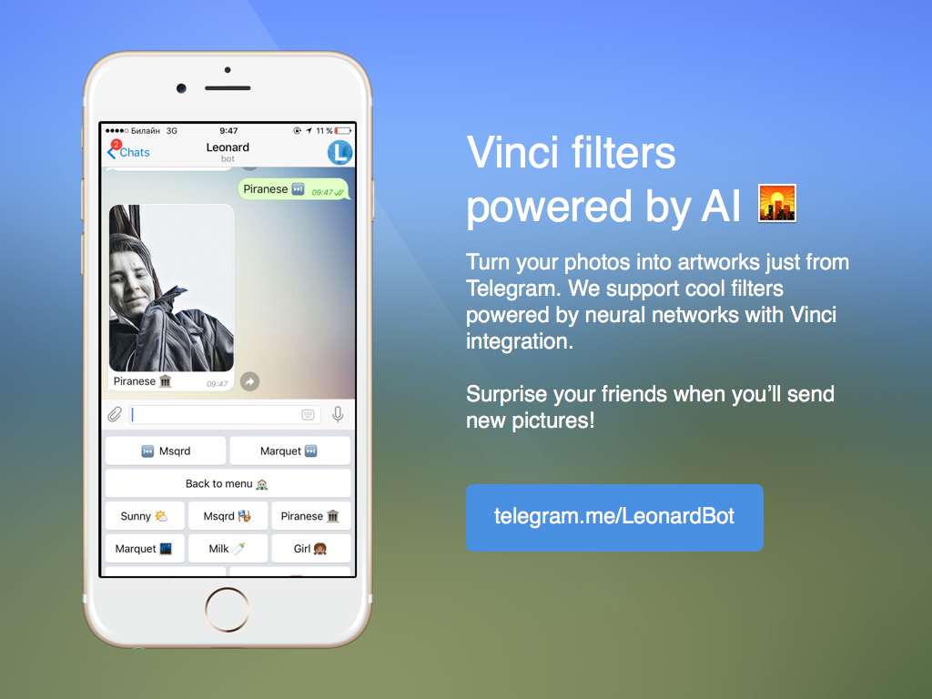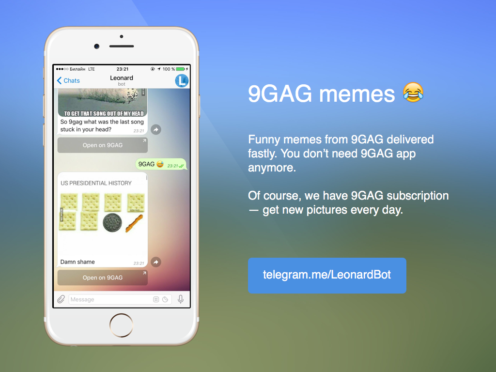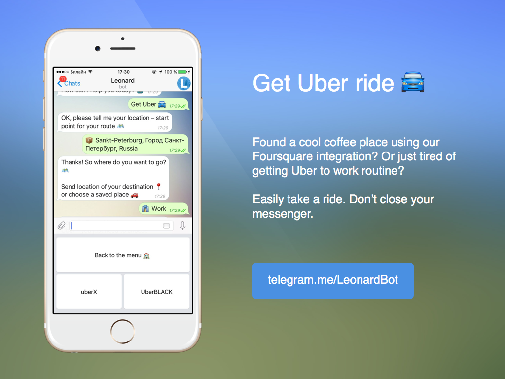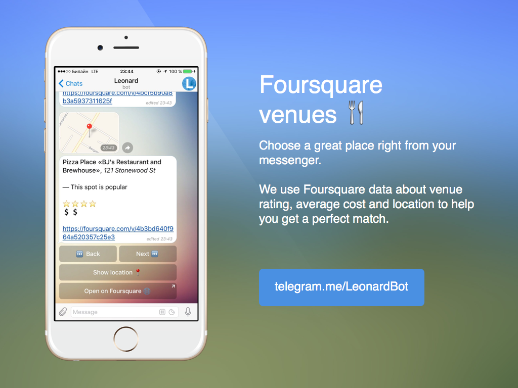 Leonard bot makes your everyday routine more fun, interesting and botish! We made powerful integrations with service you're already using such as Foursquare, Uber, 9GAG, Google News, Wolfram Alpha, Vinci (AI powered filters) and others.